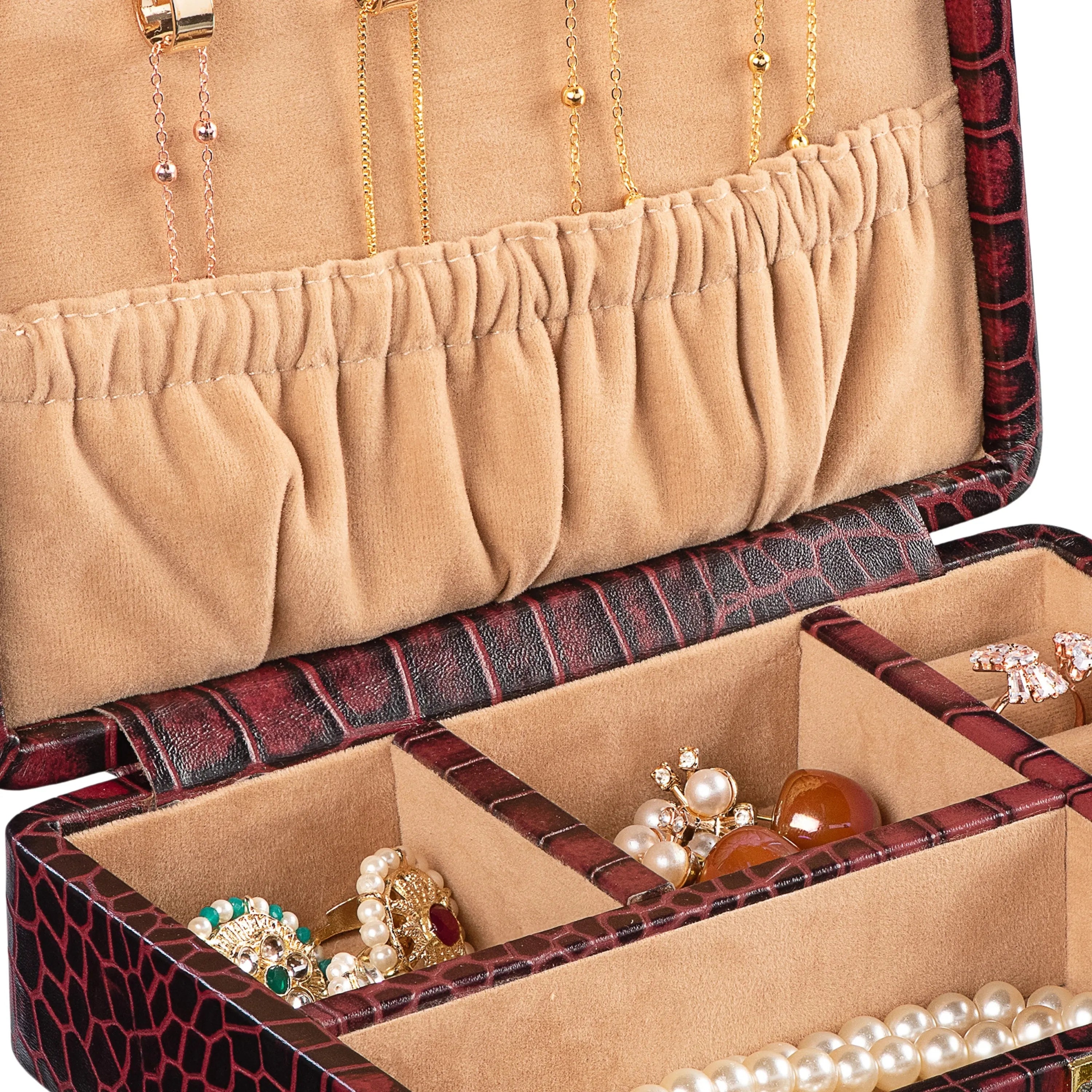 Orlena Jewellery Box | Premium Jewellery Organizer with Golden Metal Lock | Velvet-Lined Storage Case | Colour: Cherry
