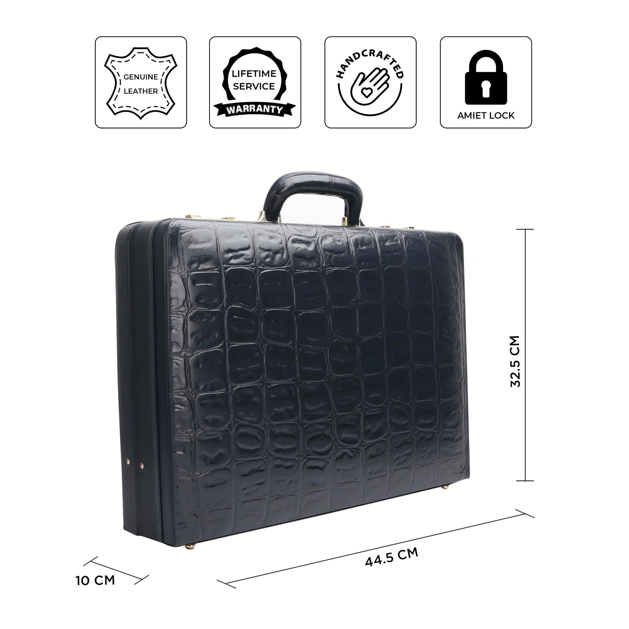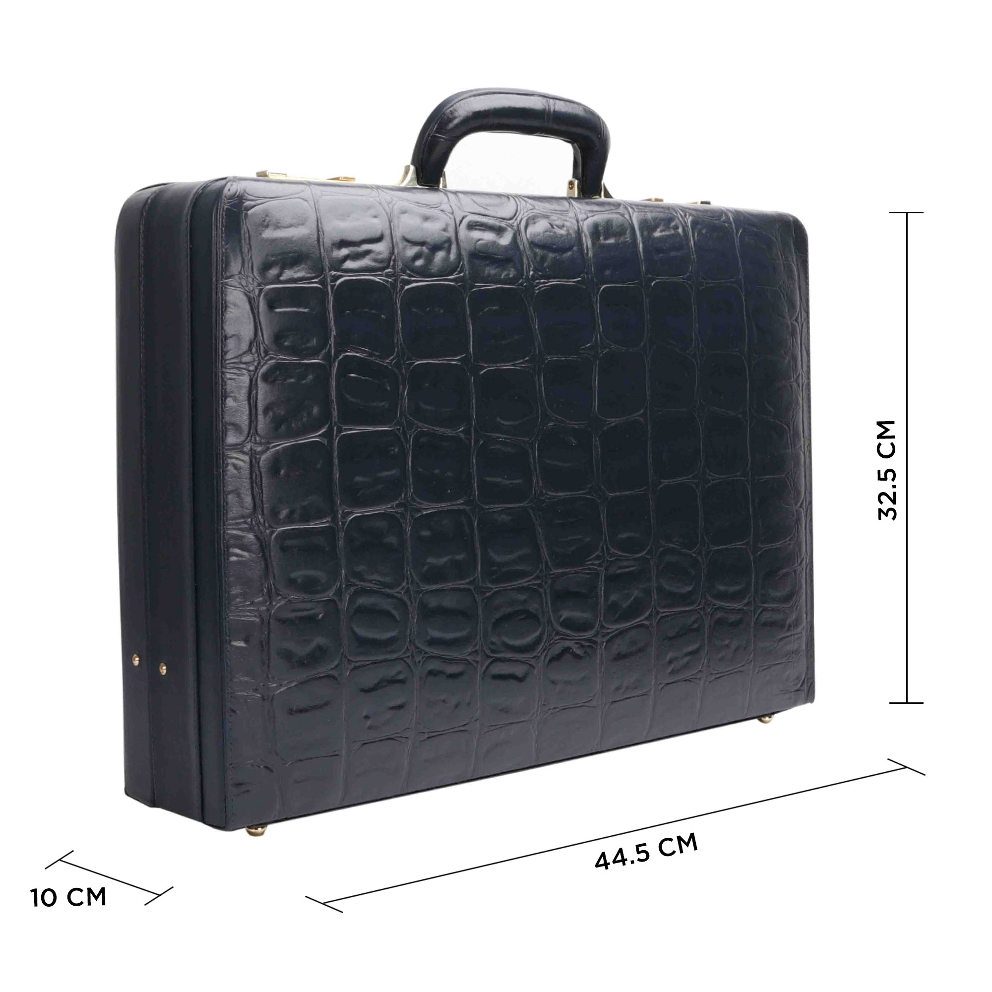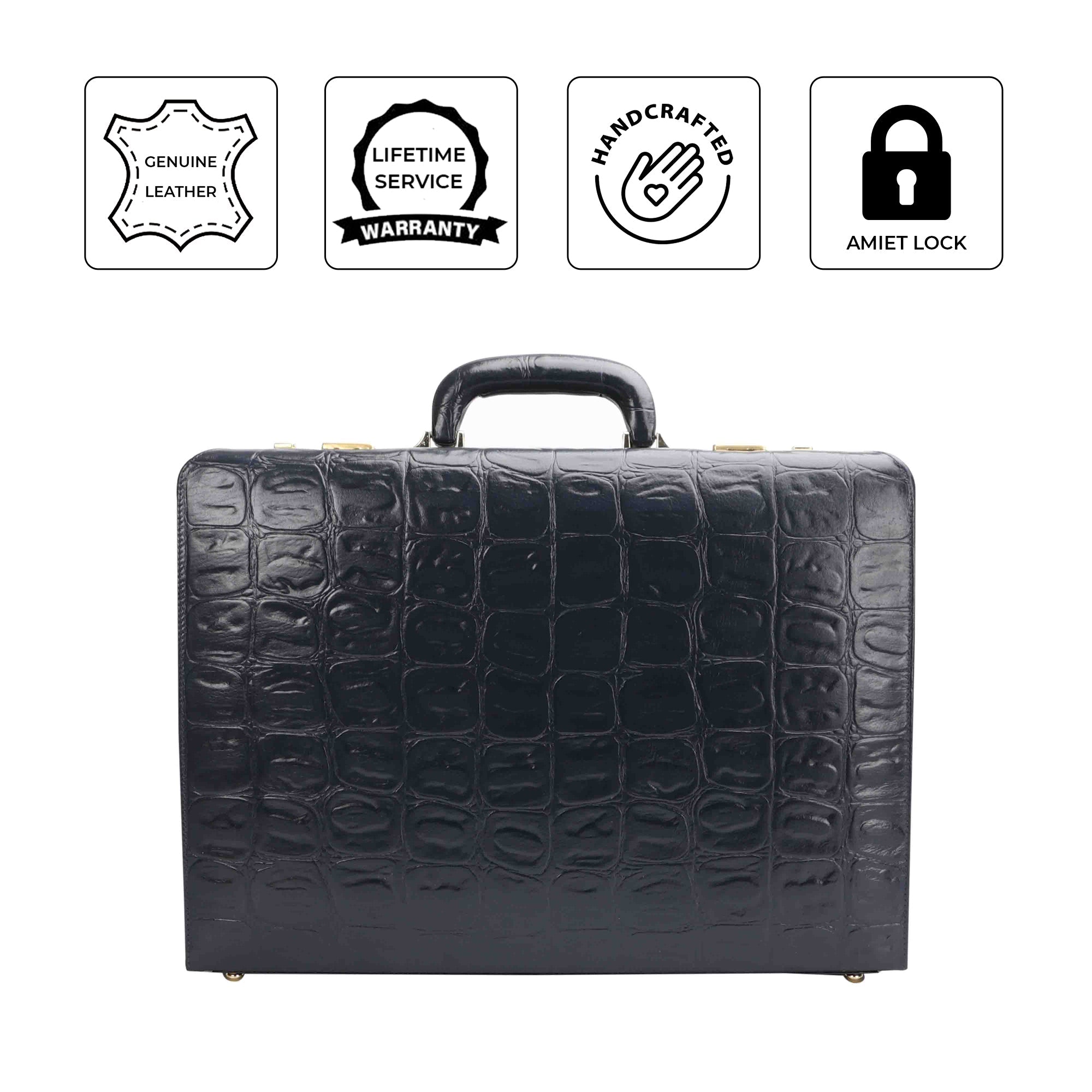 Great Dane Ruvido Double Lock Genuine Leather Briefcase, the perfect business accessory for advocates, lawyers, and executives. Crafted from premium genuine Italian leather, it offers durability, sophistication, and a luxurious feel. The Italian design featuring a classic croco tail print enhances its timeless appeal. Equipped with an Amiet Swiss three-digit combination lock, it ensures your valuables are secure. The multi-compartment interior includes space for a 15-inch laptop, files, documents, and accessories, keeping you organized on the go. The imported velvet lining adds a soft touch and enhances the overall aesthetic. Designed with a comfortable padded handle and sturdy hinges for maximum expansion, it is ideal for business professionals, lawyers, entrepreneurs, and doctors. Make a statement with a stylish, secure, and functional executive briefcase. This luxury leather attaché case is the ultimate choice for confident, professional women and men.