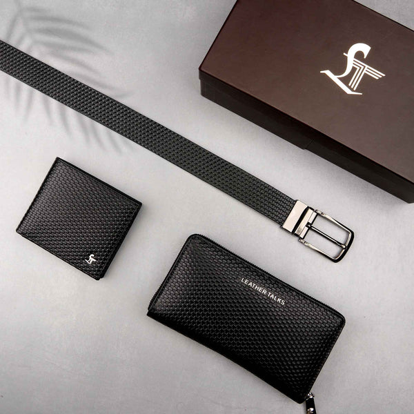 Set of III Gift Set Men's Belt, Wallet & Card Case - Premium Leather Accessories | Color- Black Leather Talks