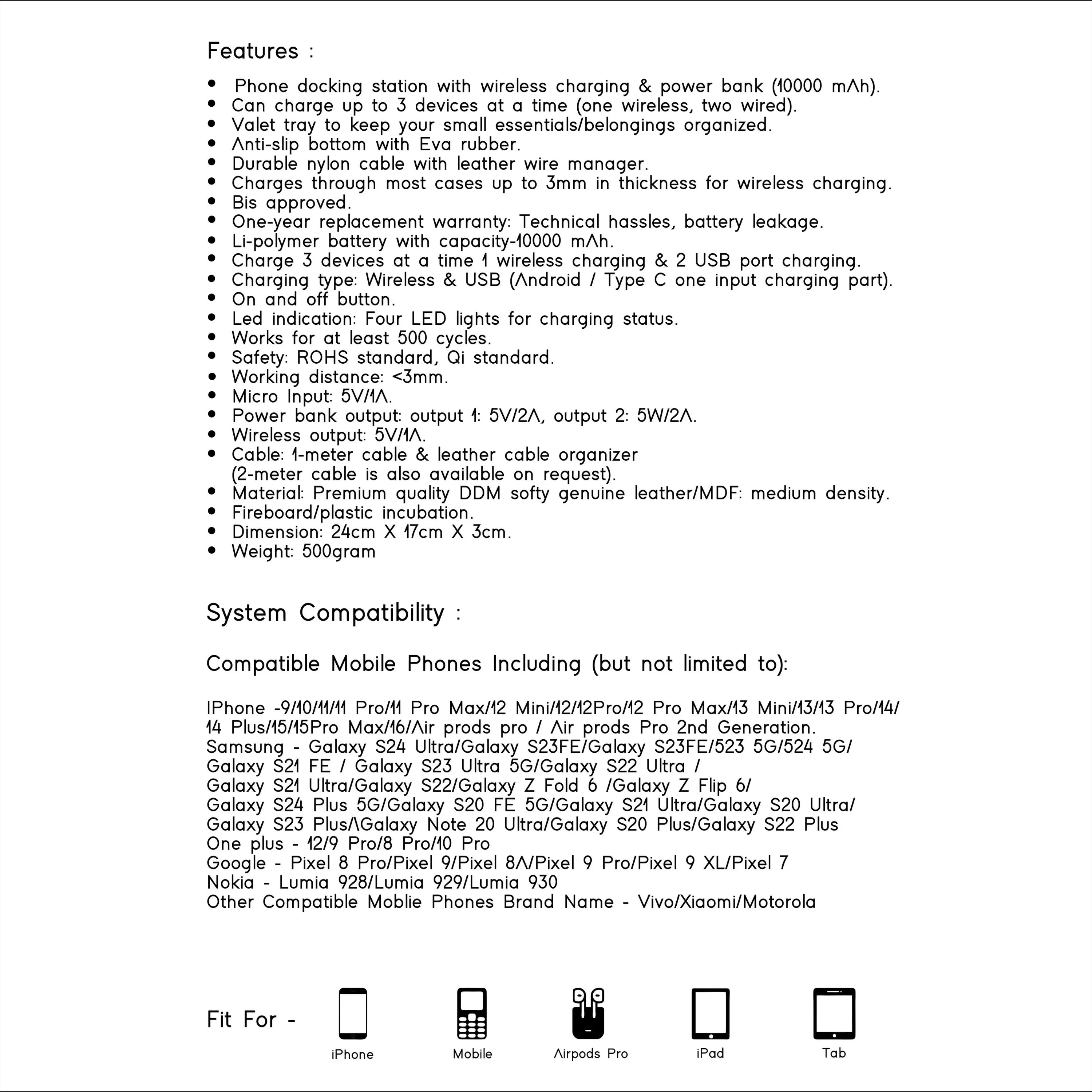 - Phone docking station with wireless charging & power bank (10000 mAh).