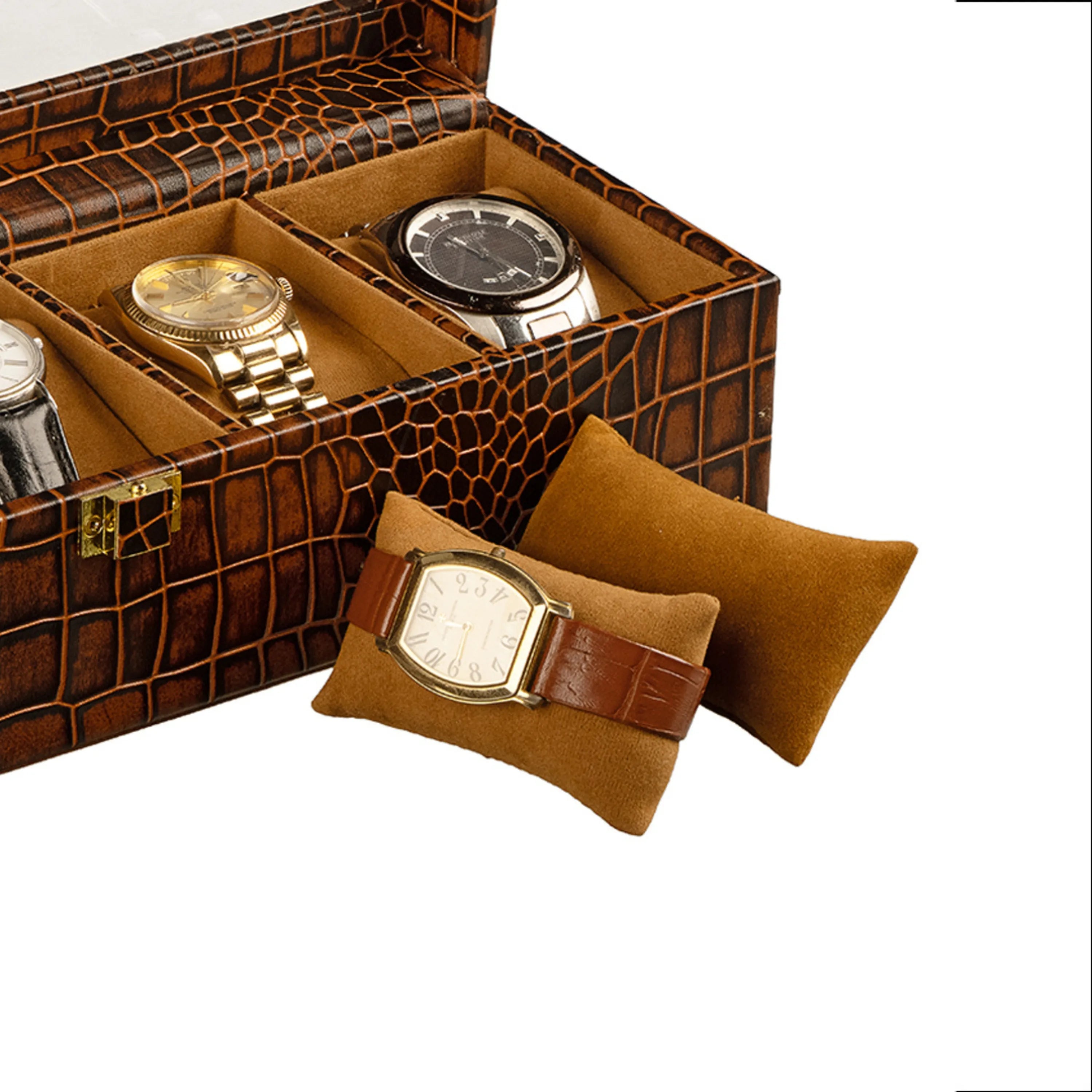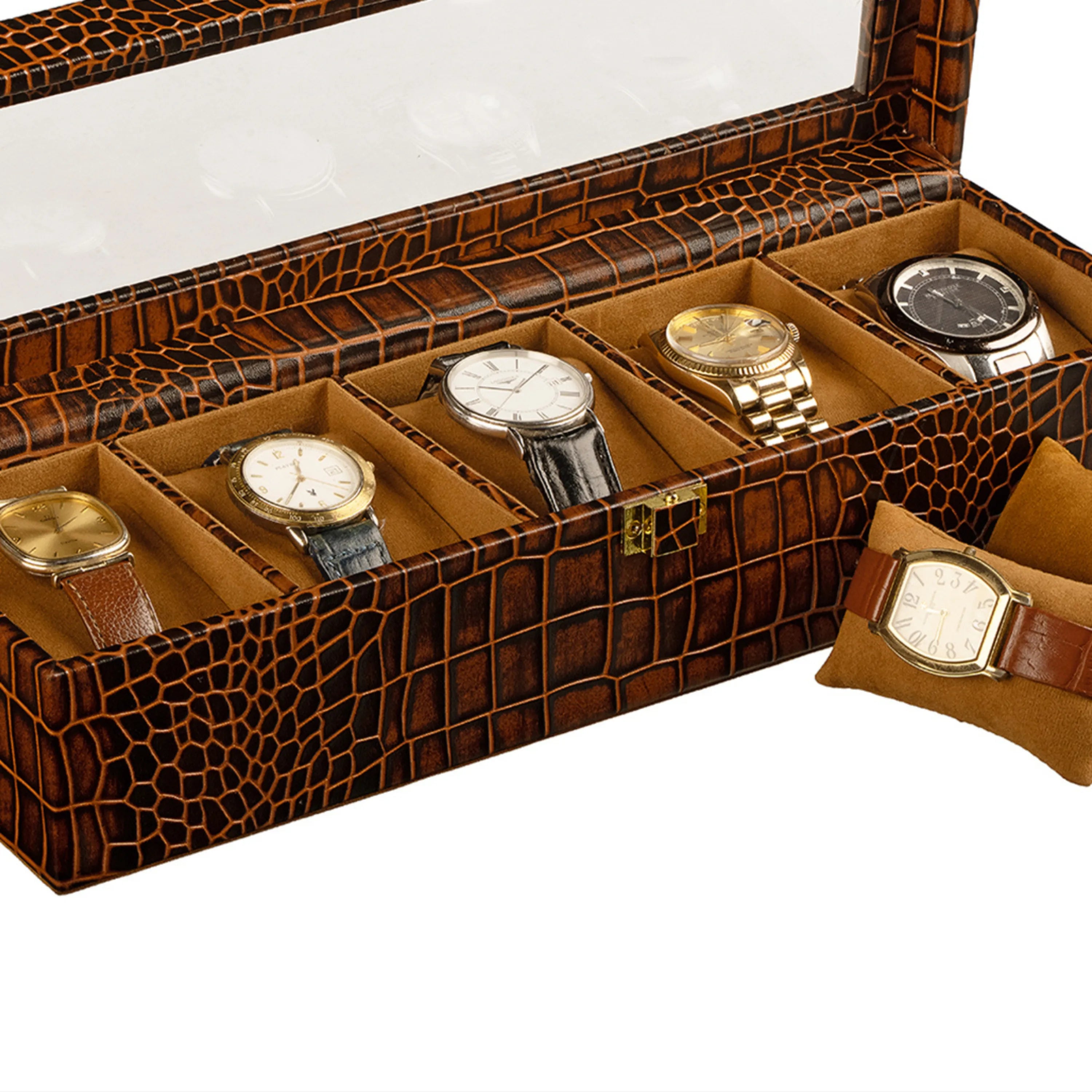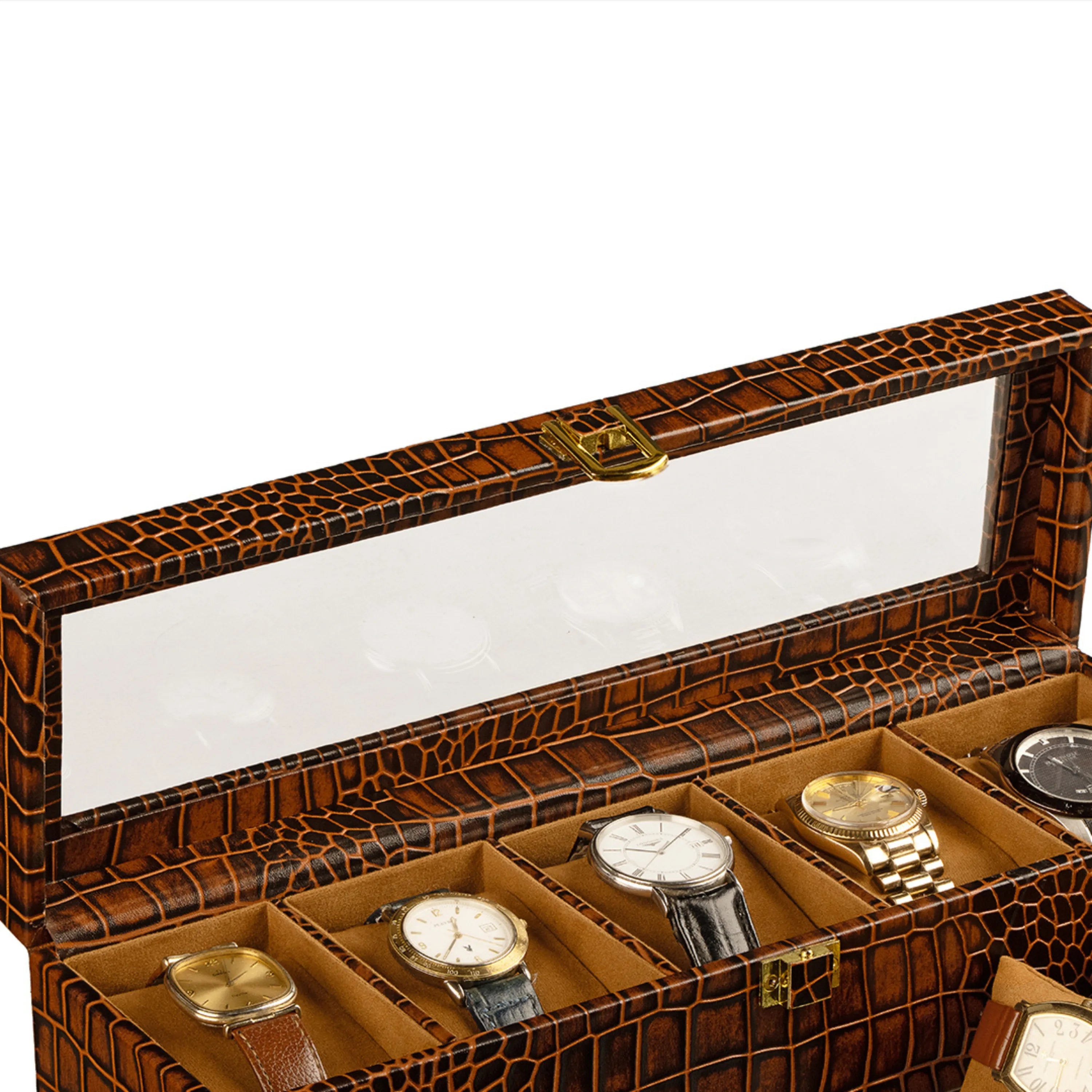 Handcrafted from premium genuine leather with a striking croco-embossed pattern, it offers a statement of refined taste. The scratch-proof acrylic top provides a crystal-clear view of your treasured collection, while the velvet-lined interior ensures each timepiece is cushioned in plush softness.