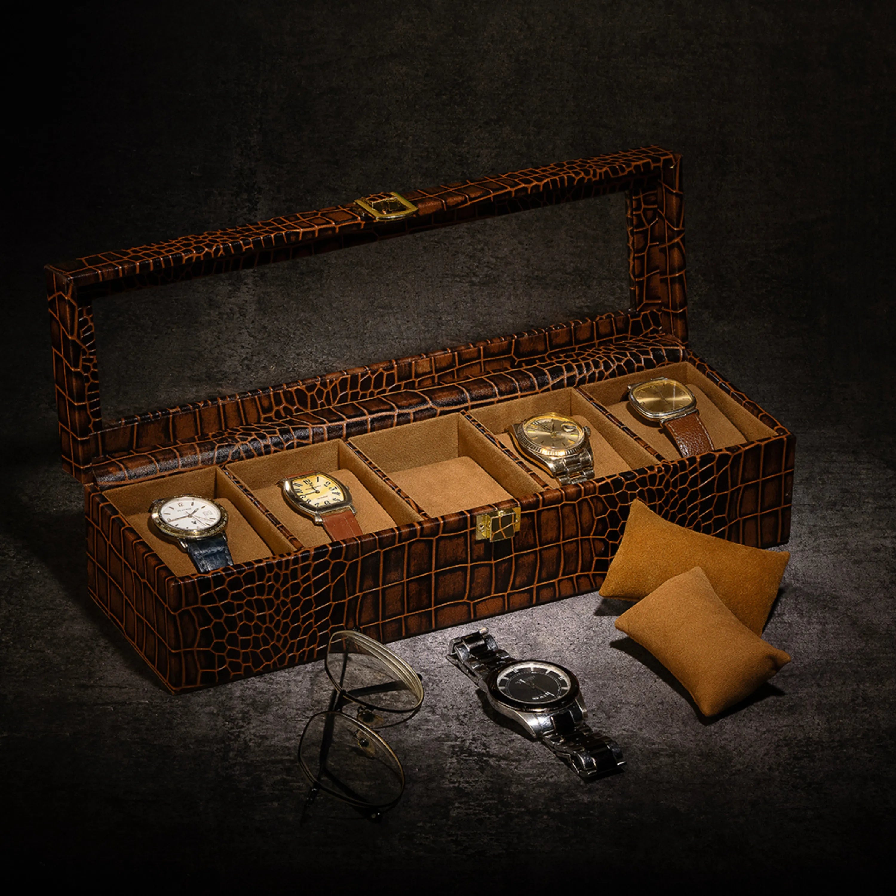 Bronx Watch Box (5 Watches) - Premium Genuine Leather Watch Box | Luxury Watch Organizer for Men | Color: Croco Tan