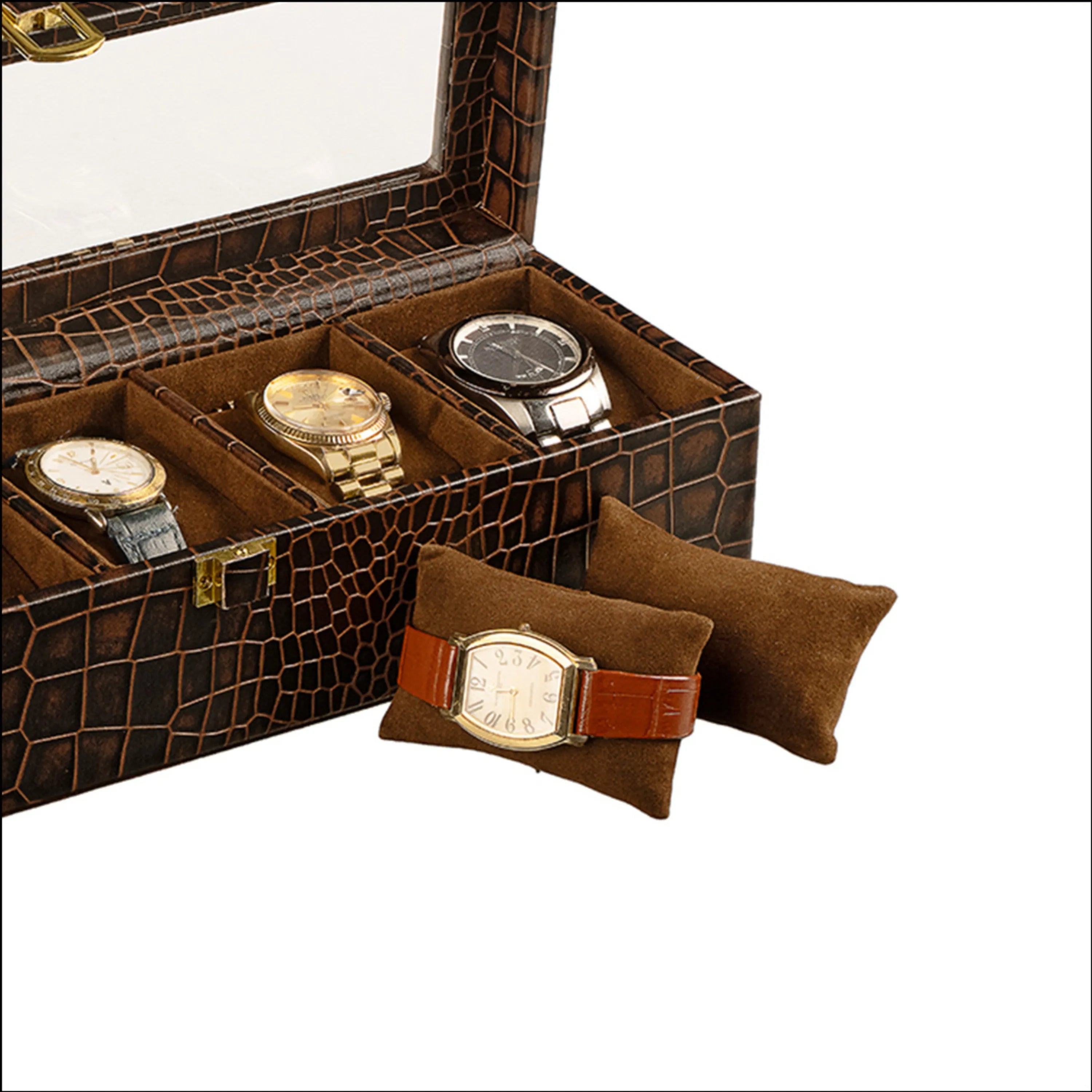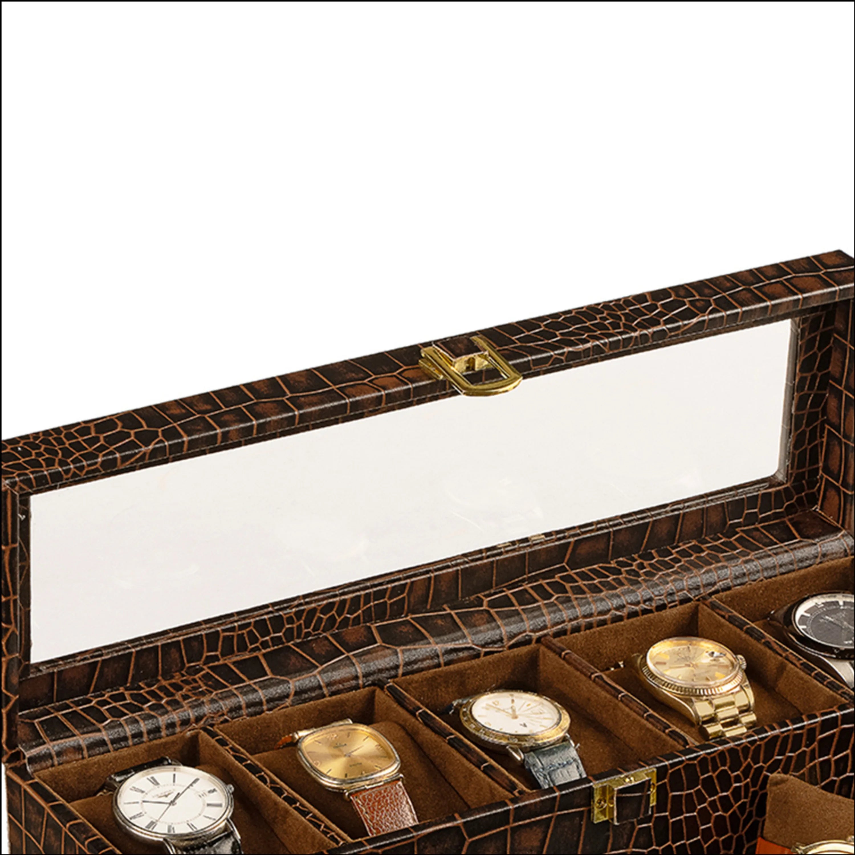 Handcrafted from premium genuine leather with a striking croco-embossed pattern, it offers a statement of refined taste. The scratch-proof acrylic top provides a crystal-clear view of your treasured collection, while the velvet-lined interior ensures each timepiece is cushioned in plush softness.
