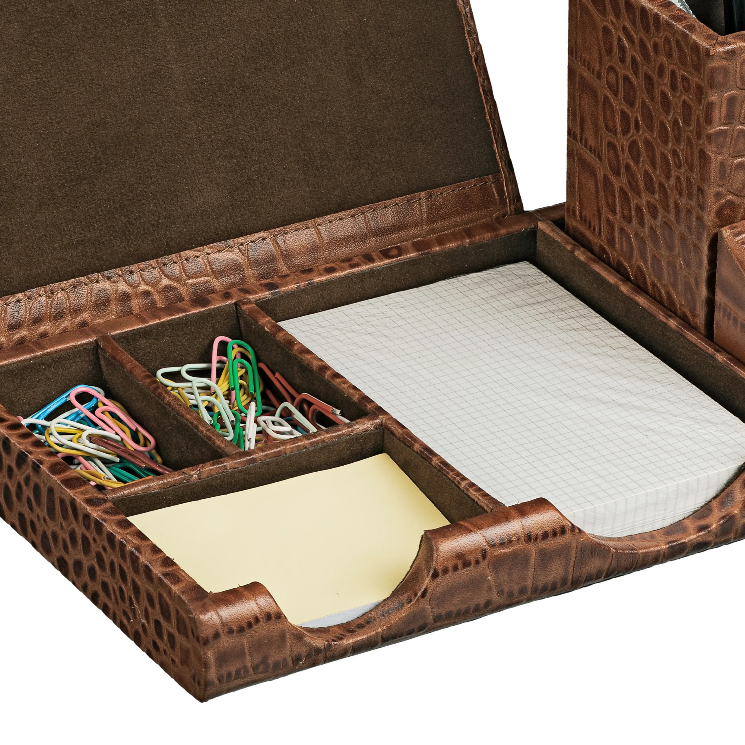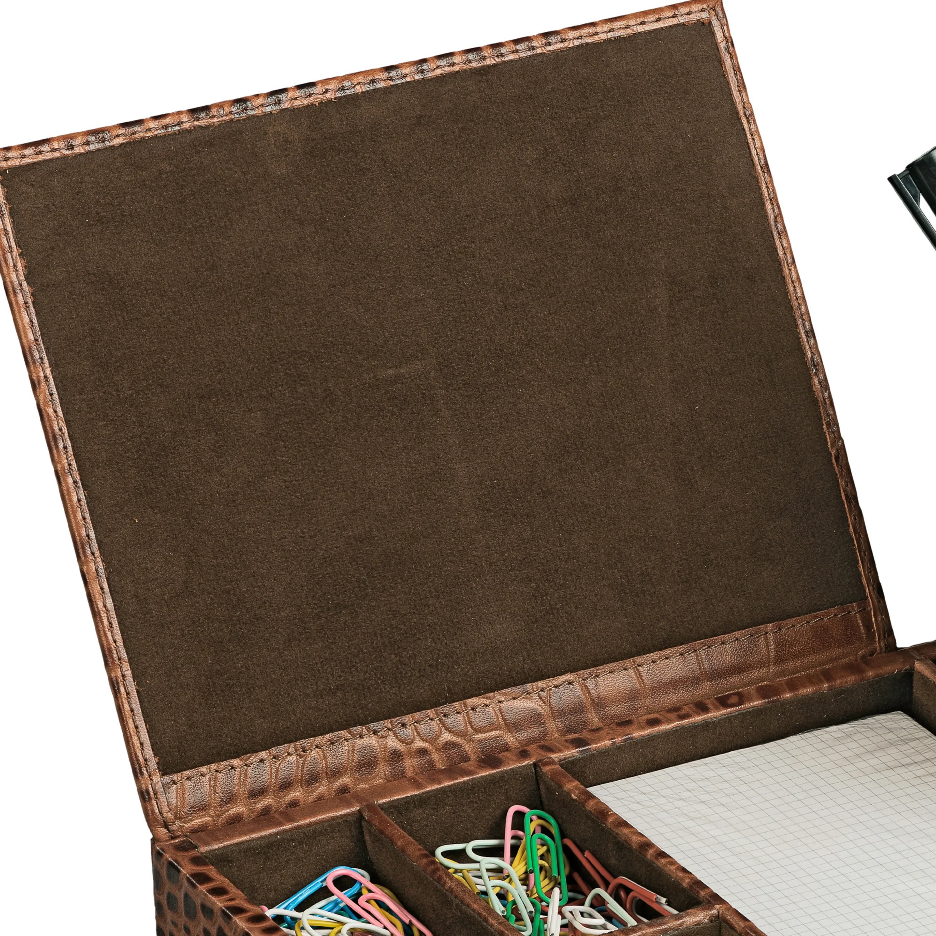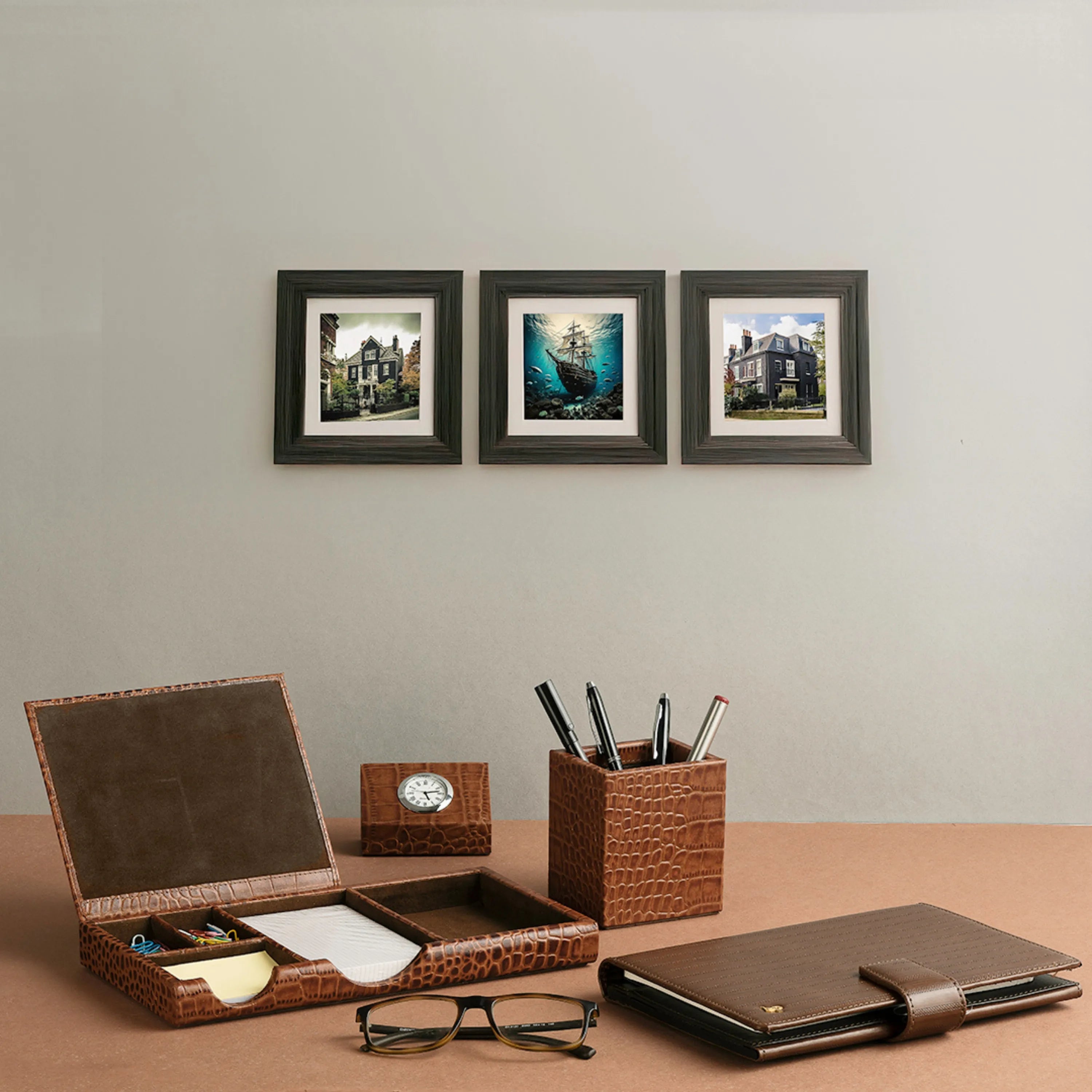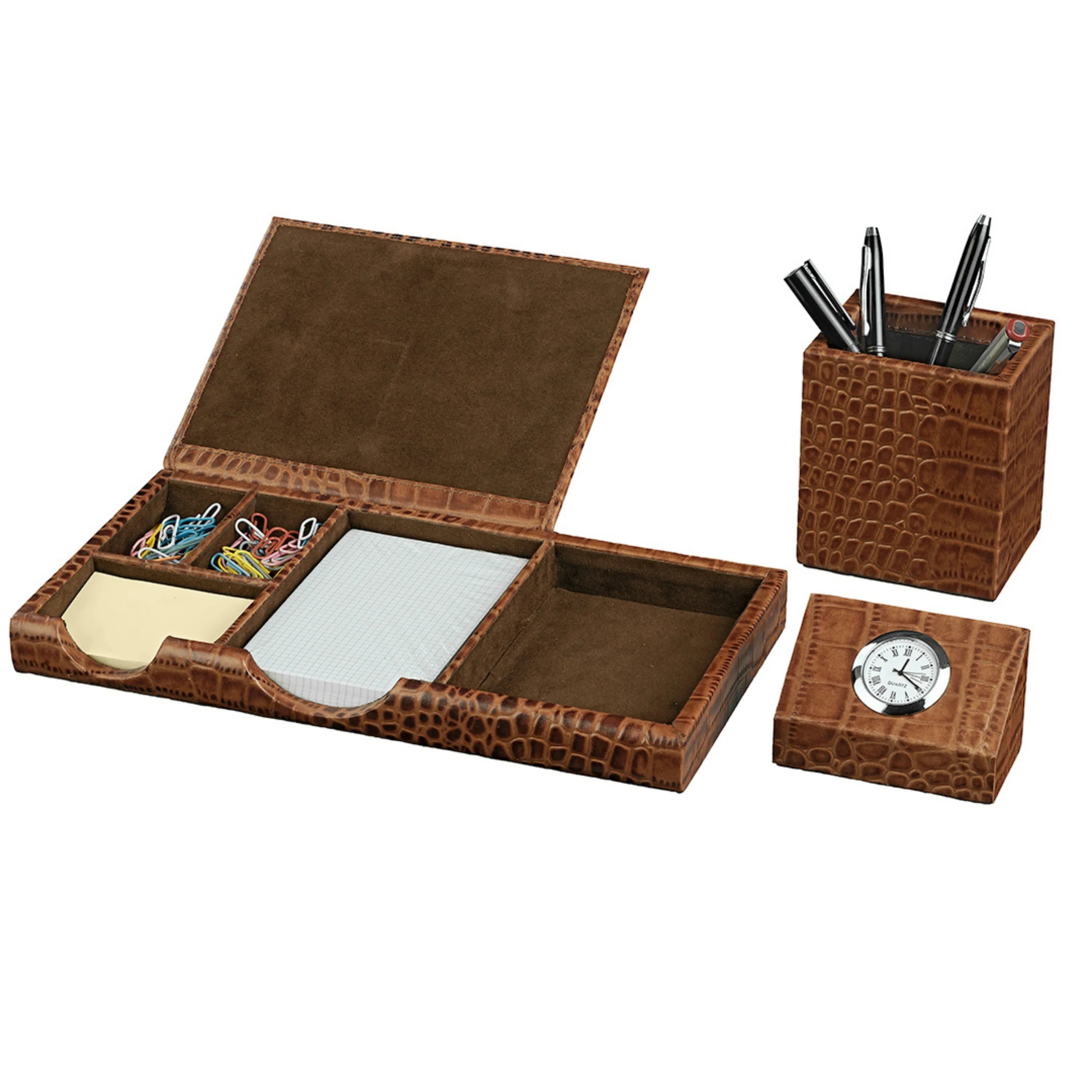Desktop Accessory Set I | Desk Organizer | Study Table Accessories | Croco Embossed Genuine Leather | Color - Tan