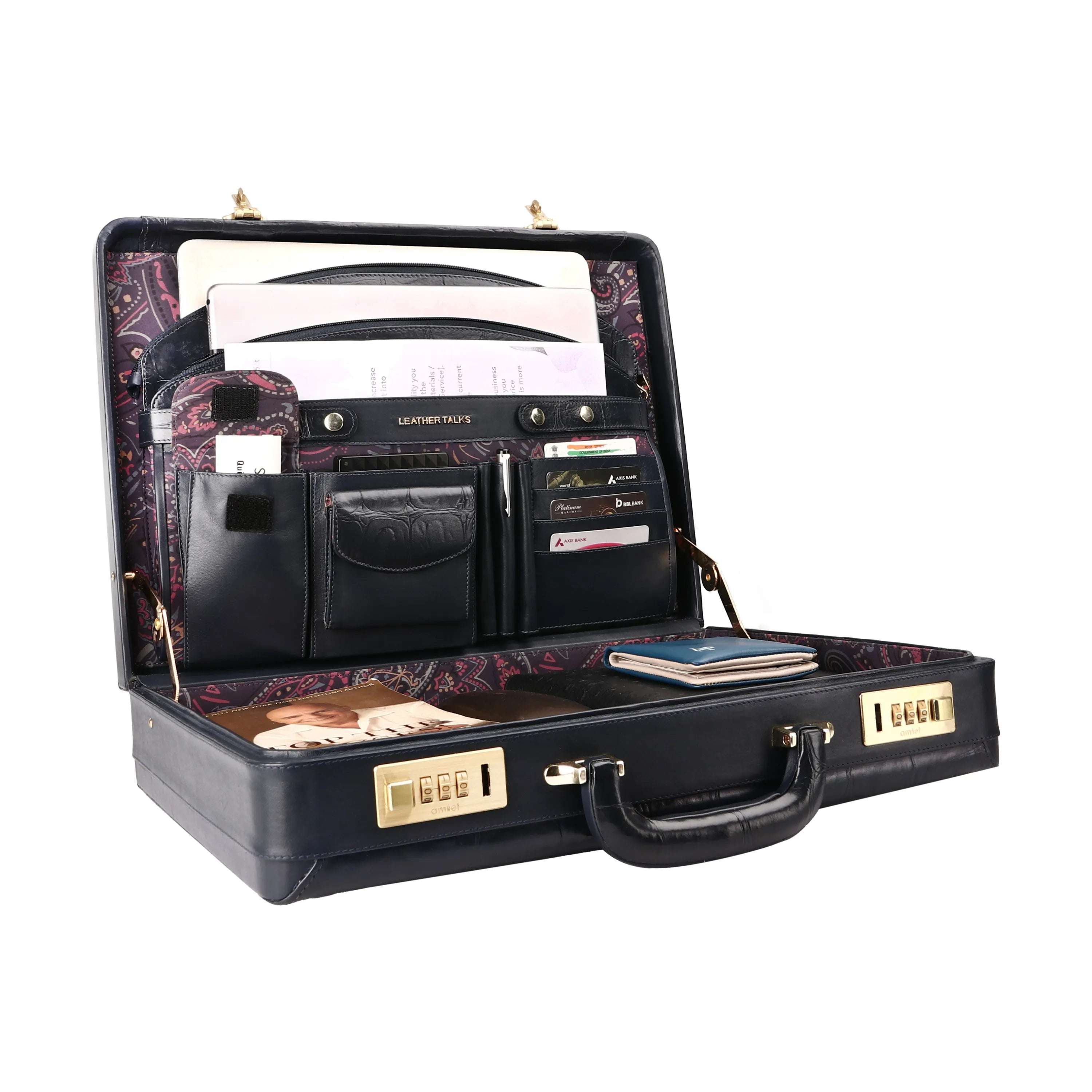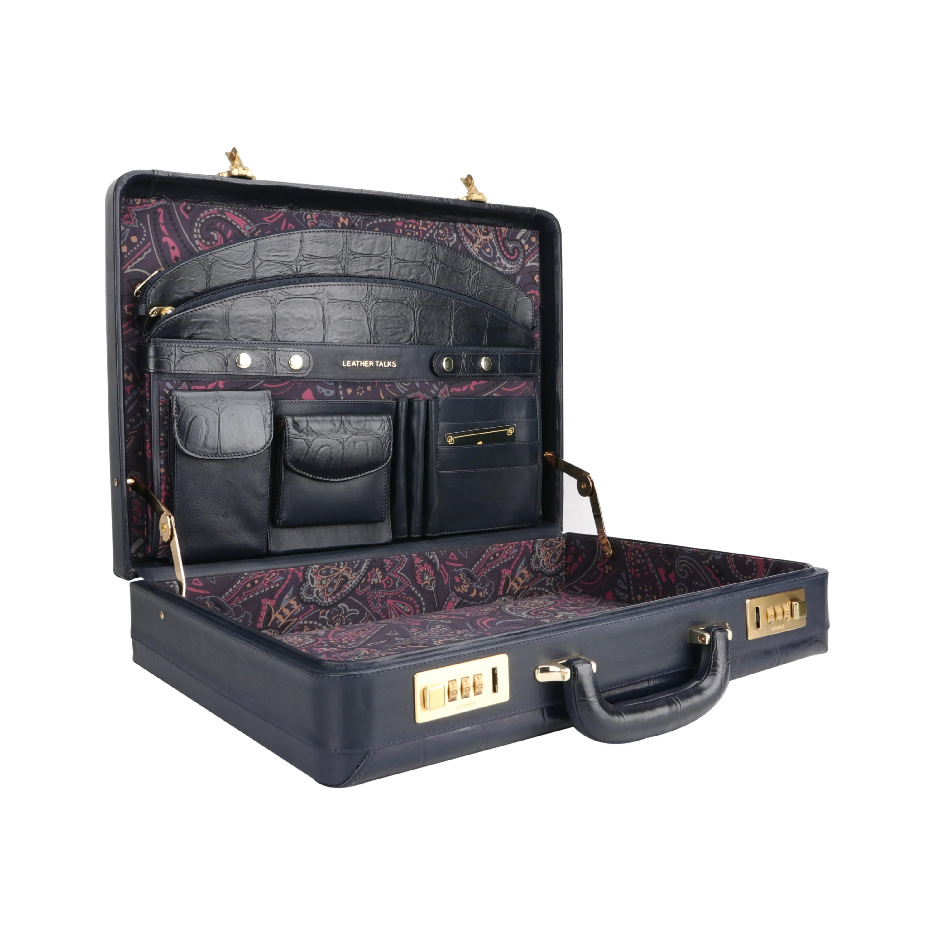 Great Dane Ruvido Double Lock Genuine Leather Briefcase, the perfect business accessory for advocates, lawyers, and executives. Crafted from premium genuine Italian leather, it offers durability, sophistication, and a luxurious feel. The Italian design featuring a classic croco tail print enhances its timeless appeal. Equipped with an Amiet Swiss three-digit combination lock, it ensures your valuables are secure. The multi-compartment interior includes space for a 15-inch laptop, files, documents, and accessories, keeping you organized on the go. The imported velvet lining adds a soft touch and enhances the overall aesthetic. Designed with a comfortable padded handle and sturdy hinges for maximum expansion, it is ideal for business professionals, lawyers, entrepreneurs, and doctors. Make a statement with a stylish, secure, and functional executive briefcase. This luxury leather attaché case is the ultimate choice for confident, professional women and men.