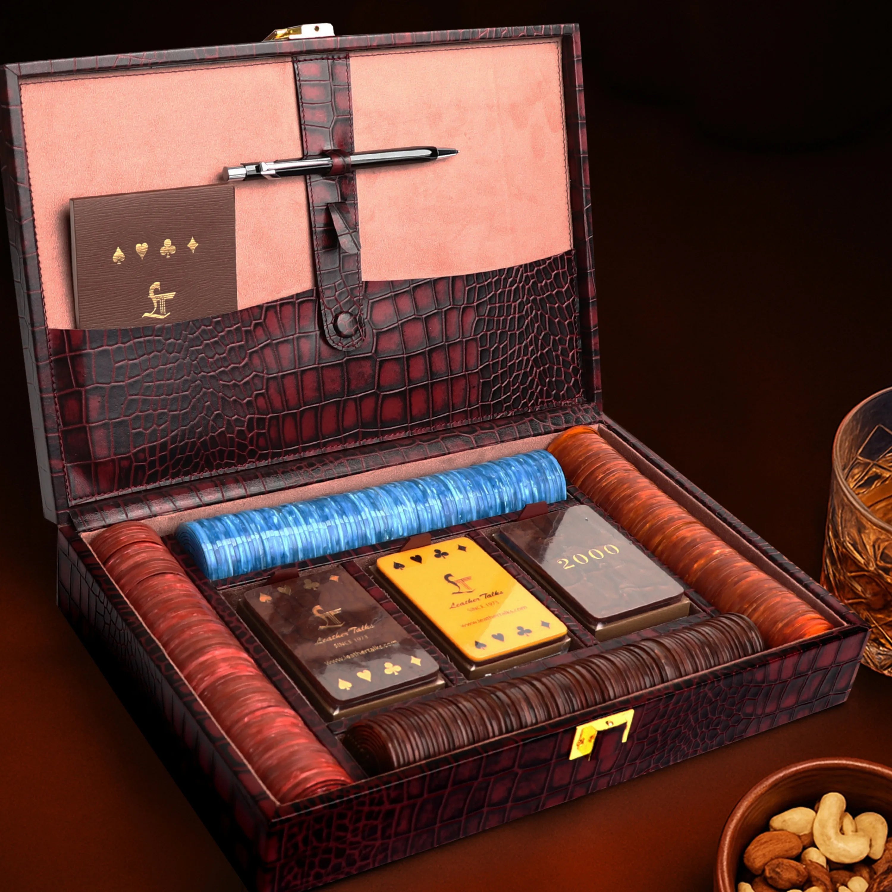 The Leather Talks Luxury Poker Box is the ultimate blend of Luxury, Craftsmanship and Functionality. Handcrafted from Deep Cut Croco Genuine Leather and finished with an imported Holland/Japanese velvet lining, this exquisite set is designed for both passionate poker enthusiasts and collectors of fine accessories.