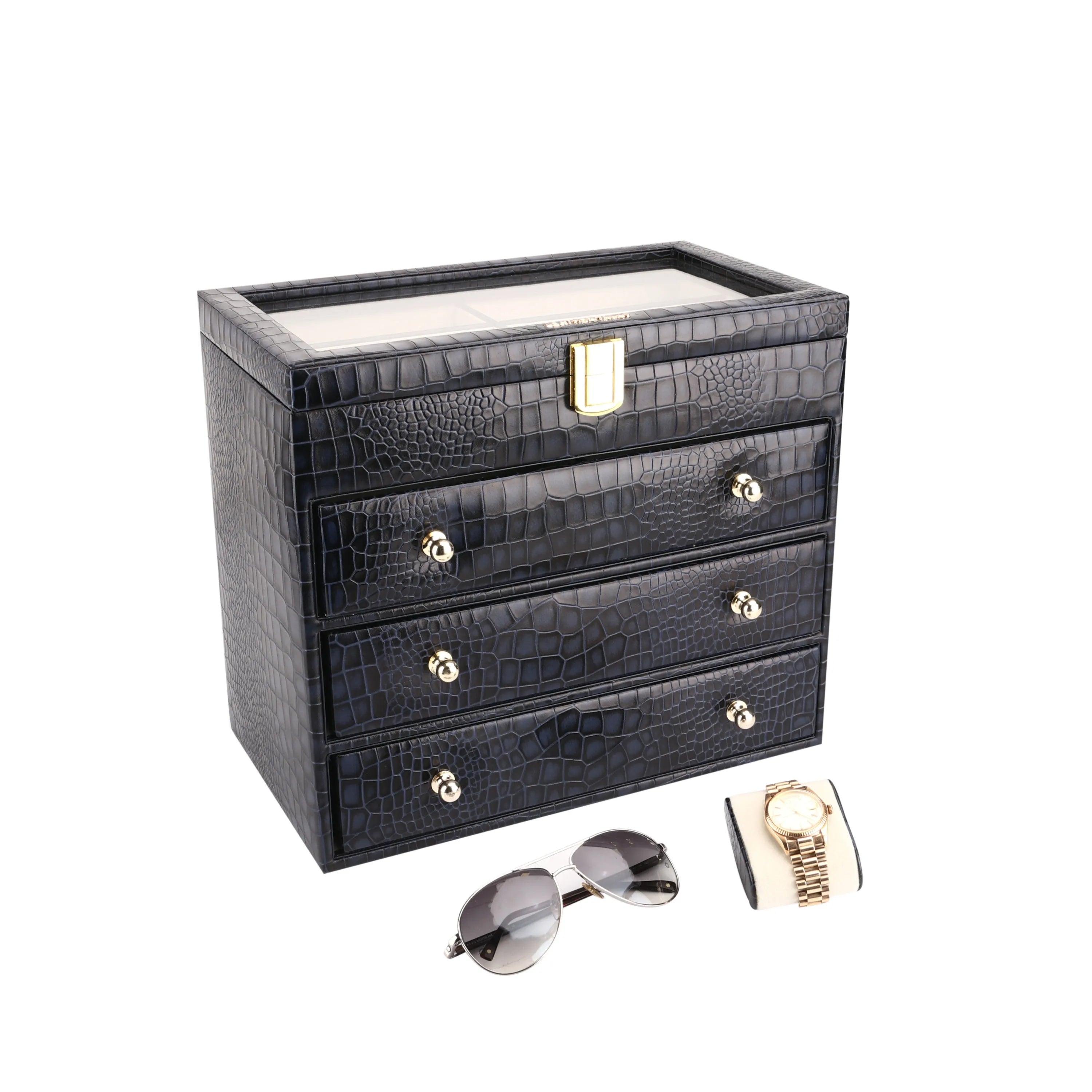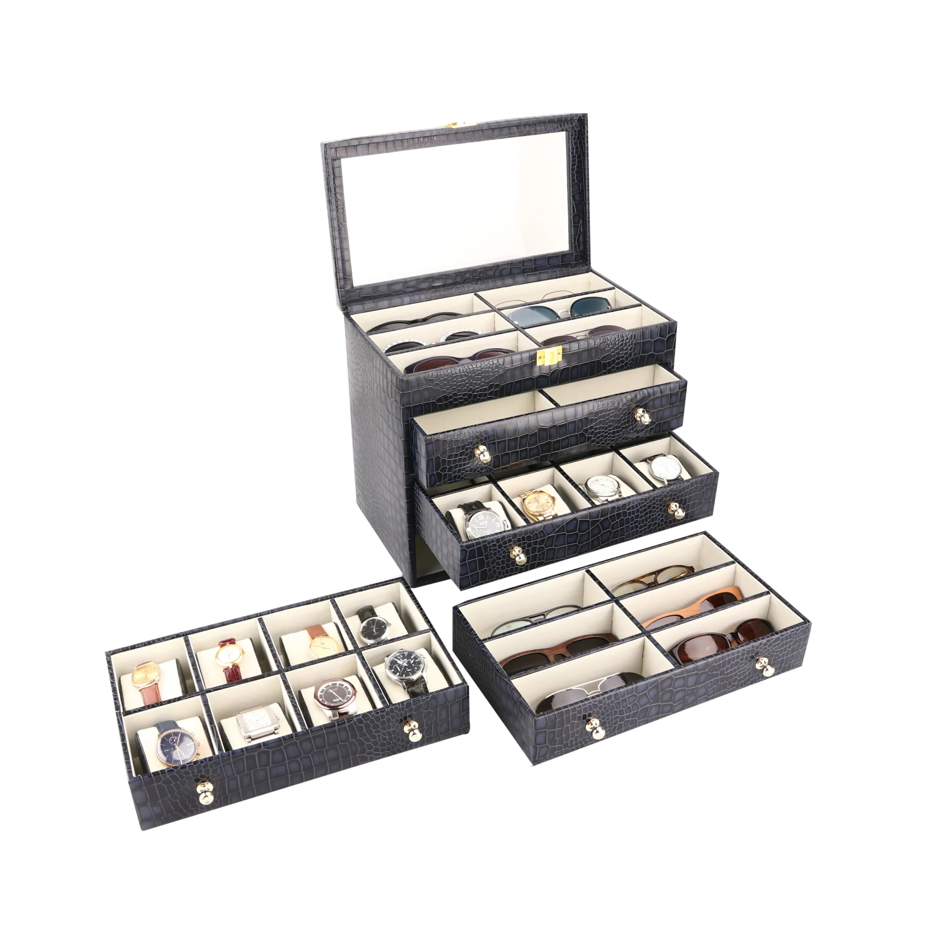 NOAH Leather Watch & Sunglass Box | Holds 24 Watches & 6 Sunglasses | Customizable Tray | Color: Blue