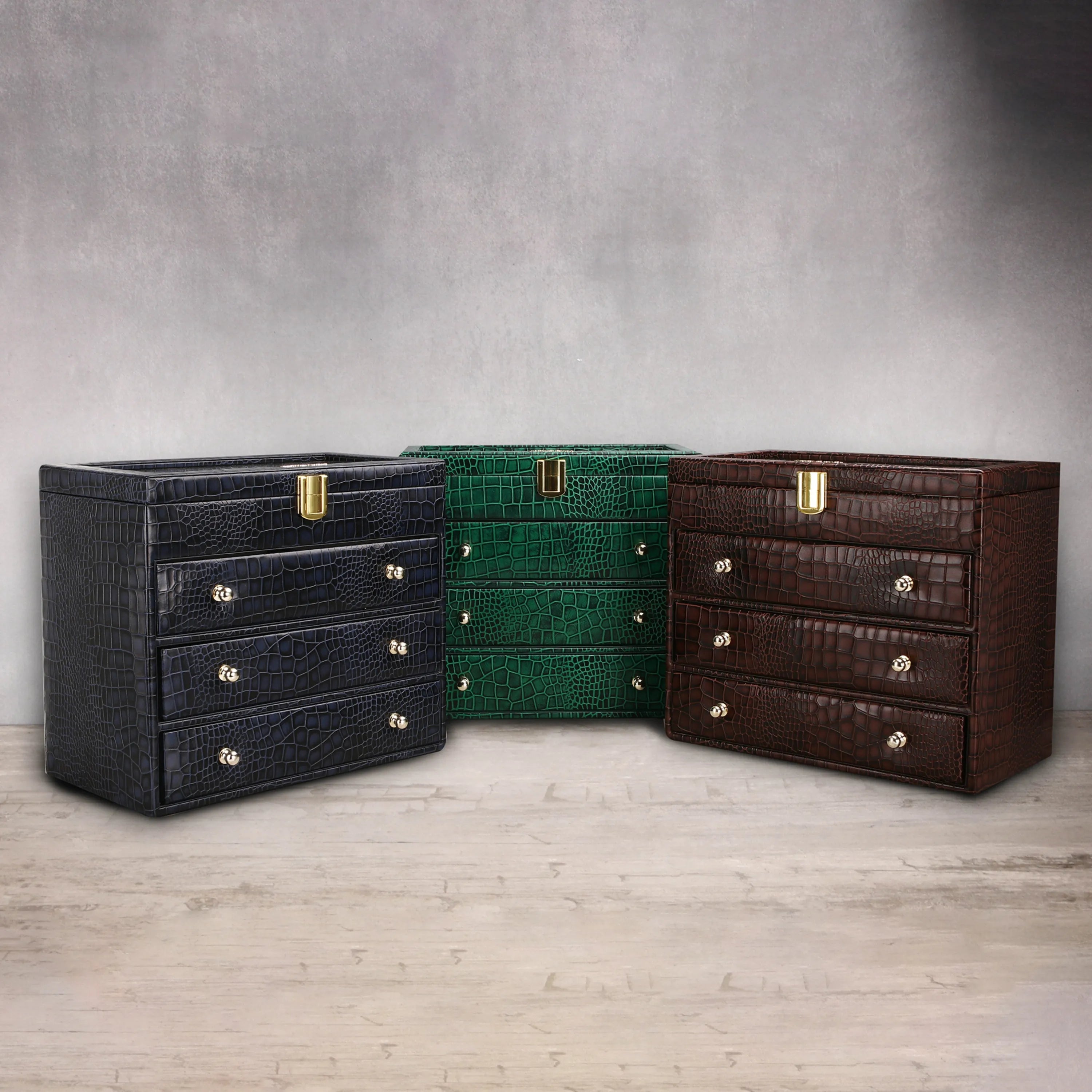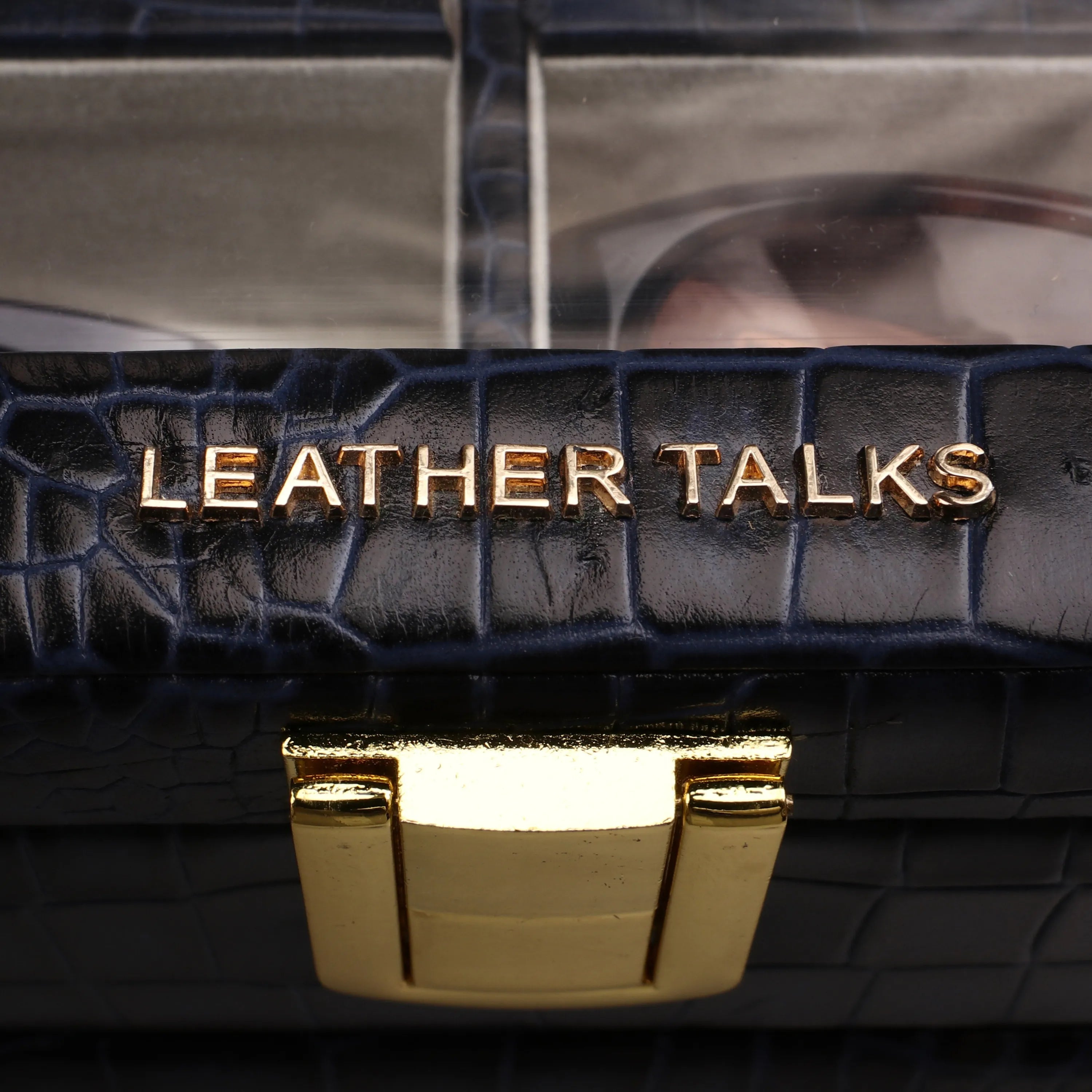 We help you step into a realm of opulence with the NOAH Sunglasses and Watch Box straight from Leather Talks. It is a tower-shaped marvel we say, as it is meticulously made out of genuine Deepcut Croco Leather and recognizes functionality and luxury. It is only designed to be a crowning jewel of your cherished wardrobe. Noah effortlessly combines utility and elegance as it serves as a sanctuary to store your precious timepieces and sunglasses as they co-exist harmoniously. It is also protected by a lavish, plush velvet lining. It is not merely a storage box, but a statement piece that amplifies the class of any room it graces. Having customizable trays, a sleek design, and a premium metal lock, the NOAH box is the ultimate accessory for discerning individuals valuing organization and style.