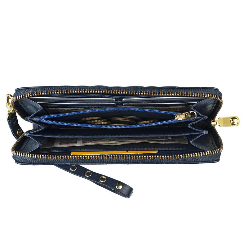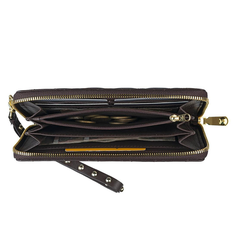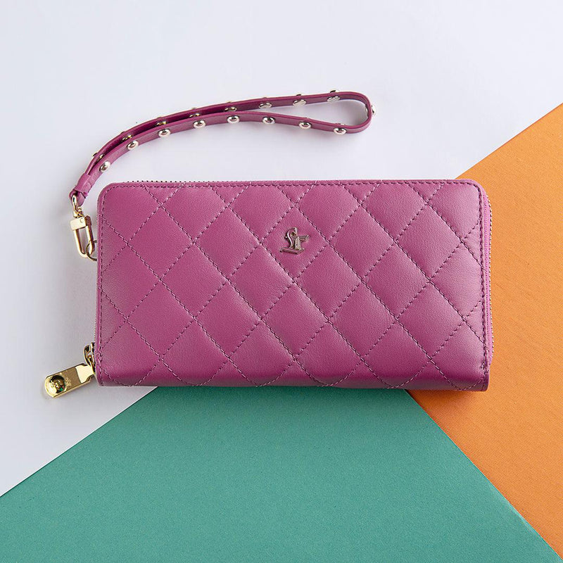 With a quilted pattern on the palm tree trunk, this black-coloured Ladies Palm II Wristlet wallet is a combination of class and practicality. Quilted stretch with rivet handle. Carry it seamlessly without worrying about it getting dirty. A nice rivet handle that you can easily hold with the paw of your hand. Its leather quality makes it a sturdy wallet.