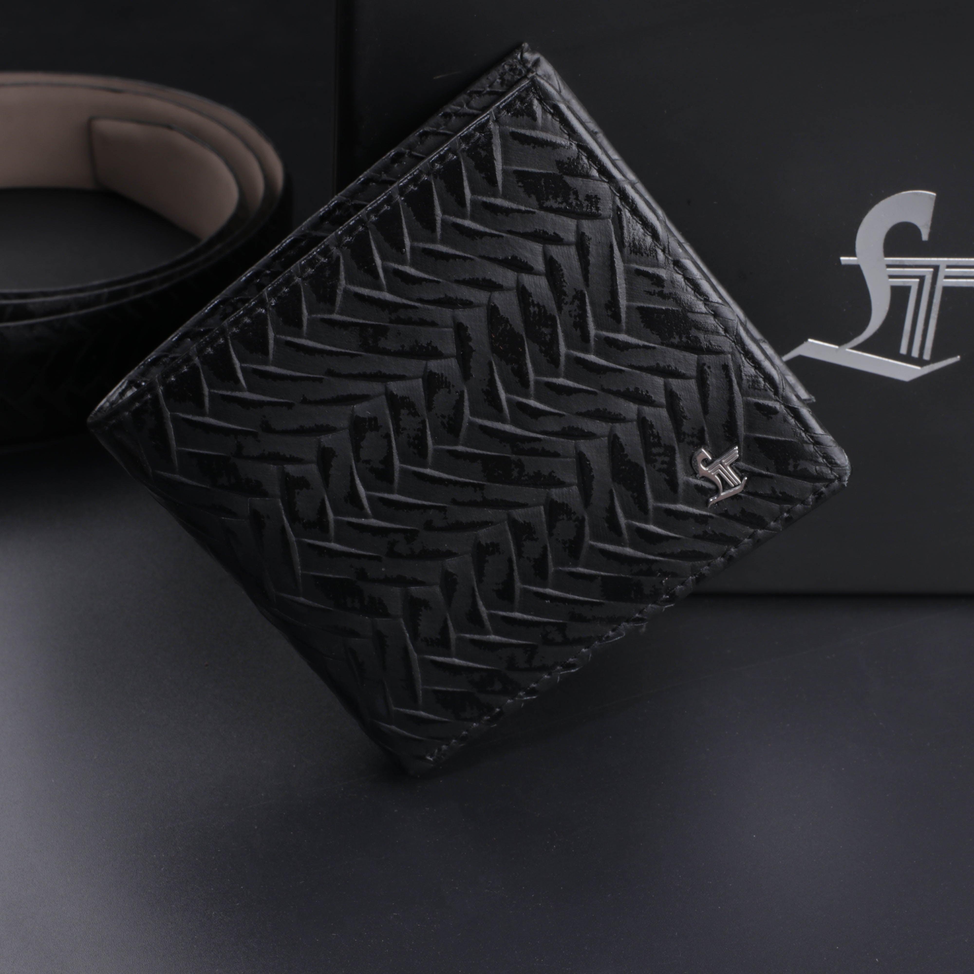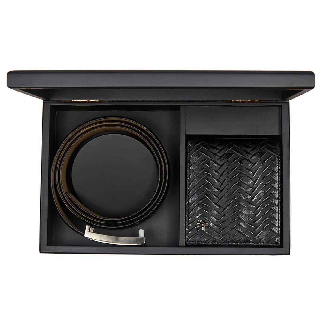 Premium Italian Weave Black Wallet Belt Set with Wooden Gift Box