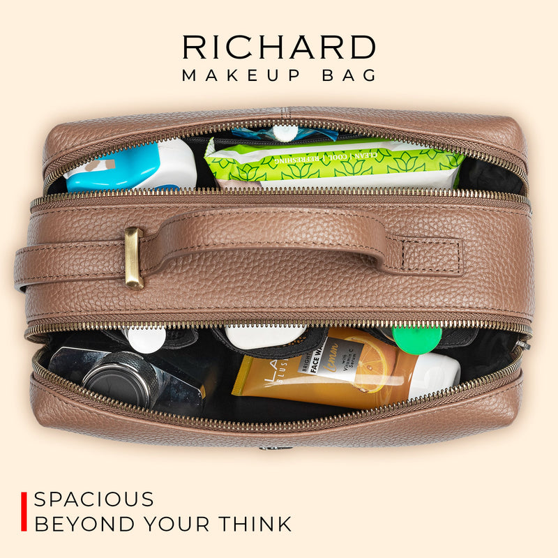 Richard's Genuine Leather Makeup Bag for Women | Makeup Organizer Bag | Cosmetic bag for Travel | color: Tan, Black, Blue, Brown, Green