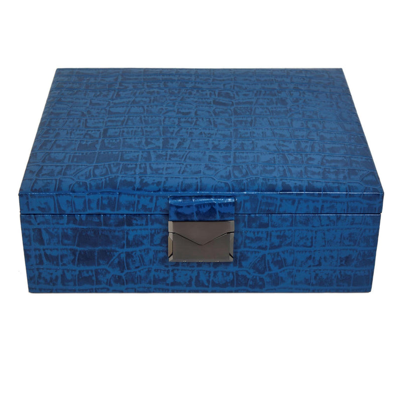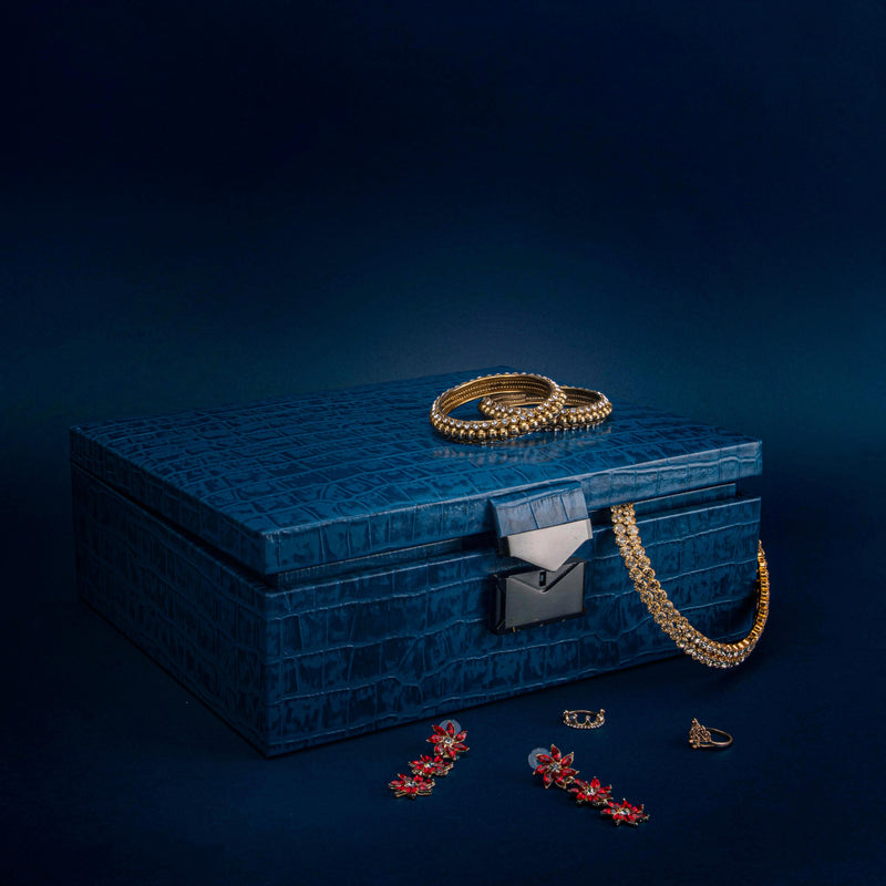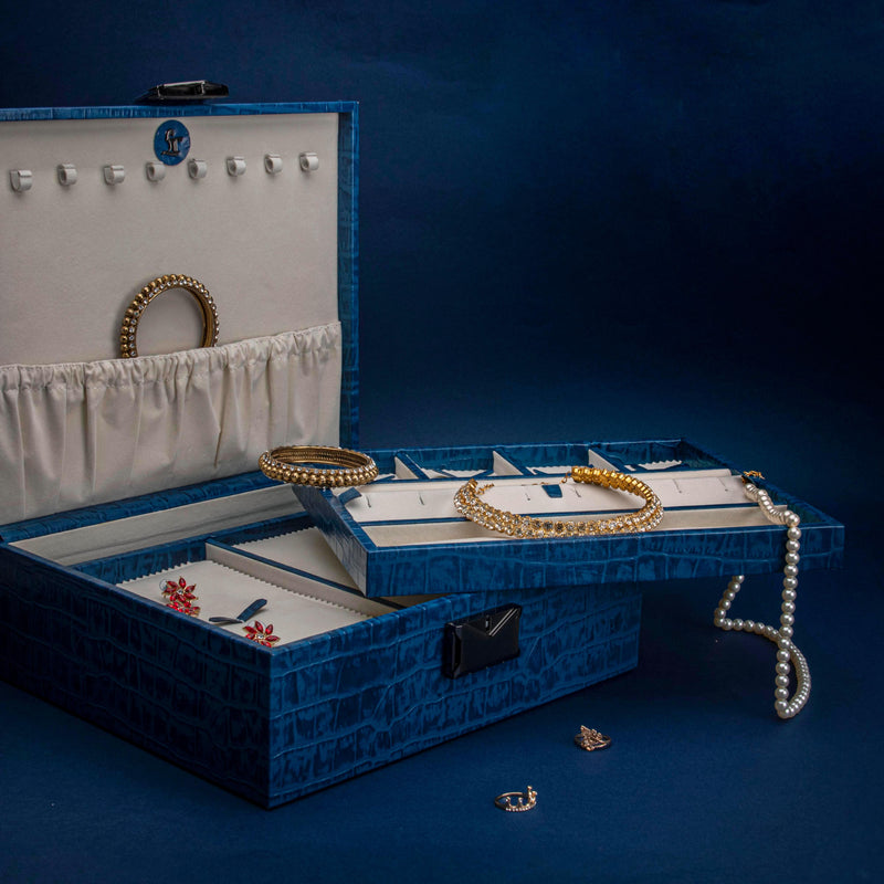 Royce Double Tray Jewellery Box | Premium Luxury Genuine Leather Jewellery Box | Elegant Organizer for Rings, Necklaces & Earrings | Color: Croco Blue