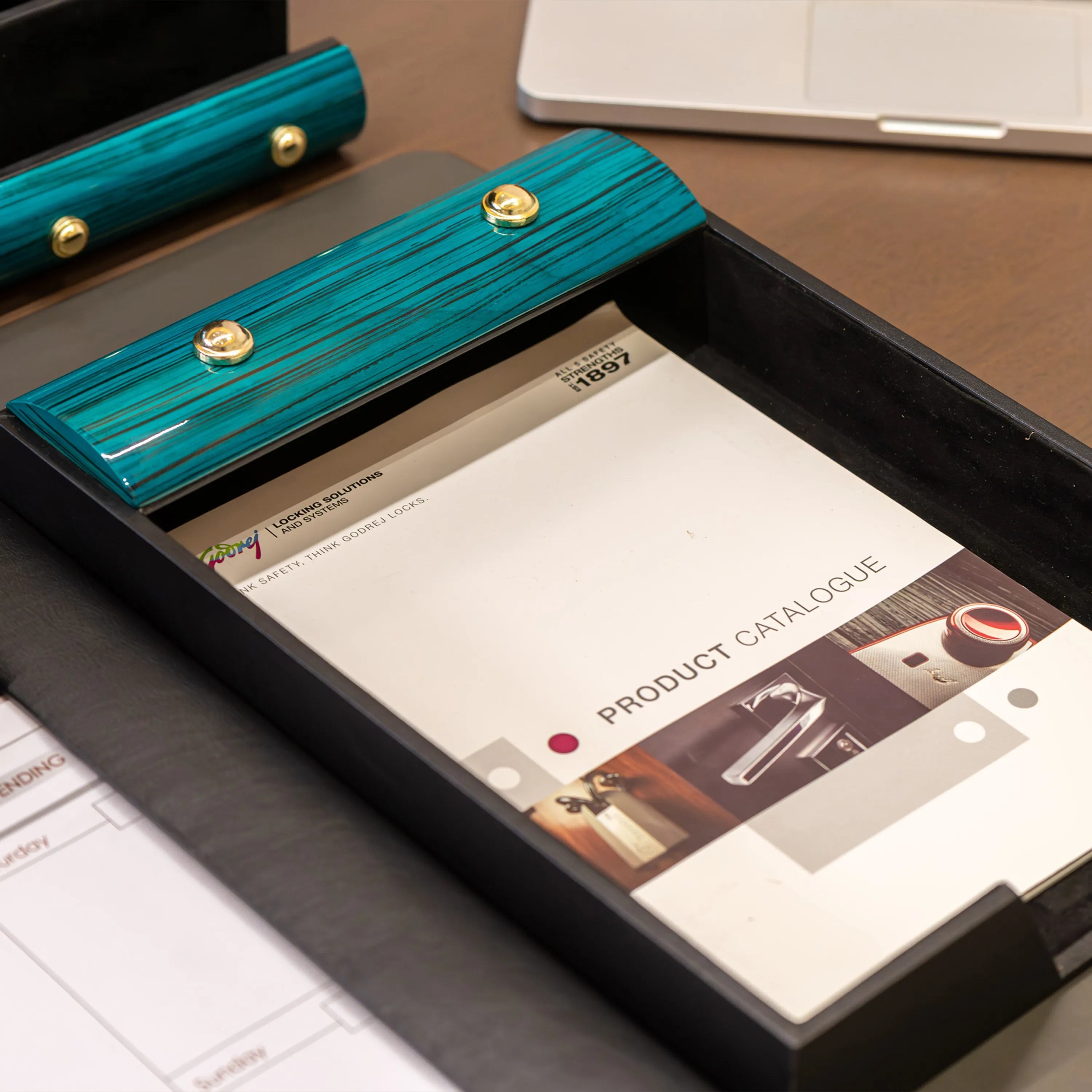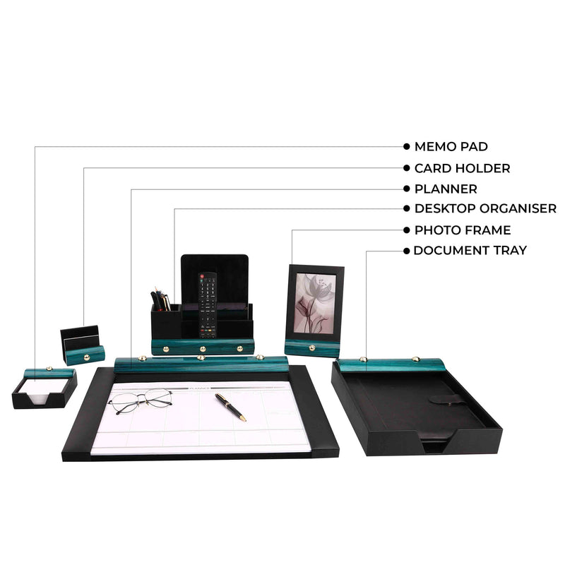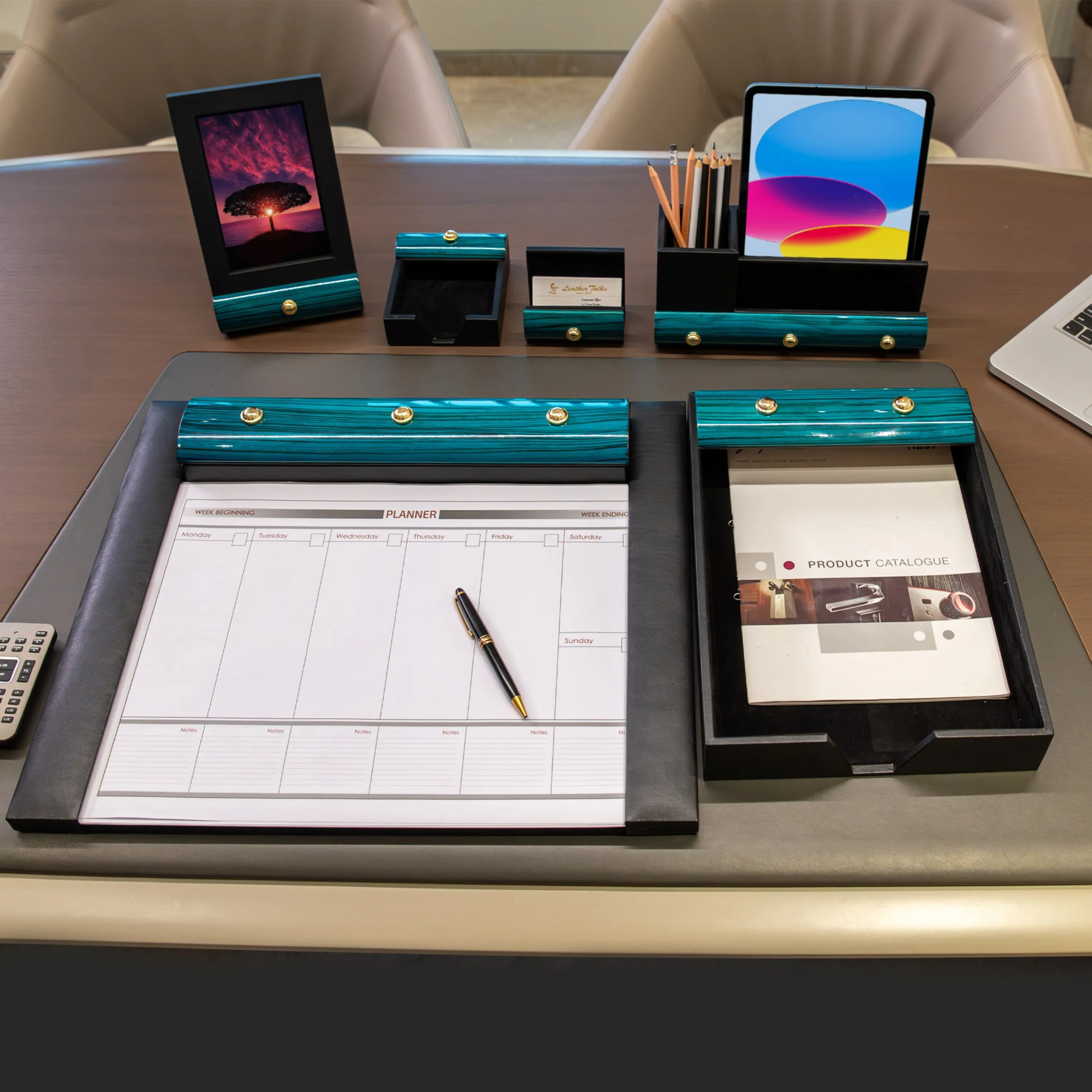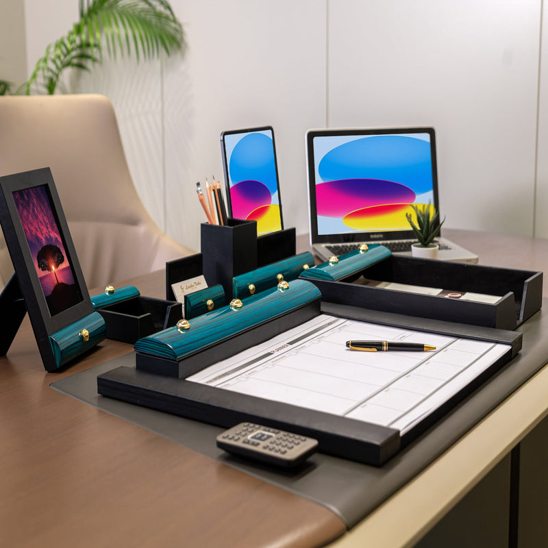Wood Leather Desktop Planner Set | Genuine Leather Desktop Planner Set | Premium Office Desk Accessories & Luxury Work Organizer | Color - Teal Blue with Black