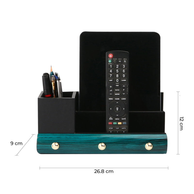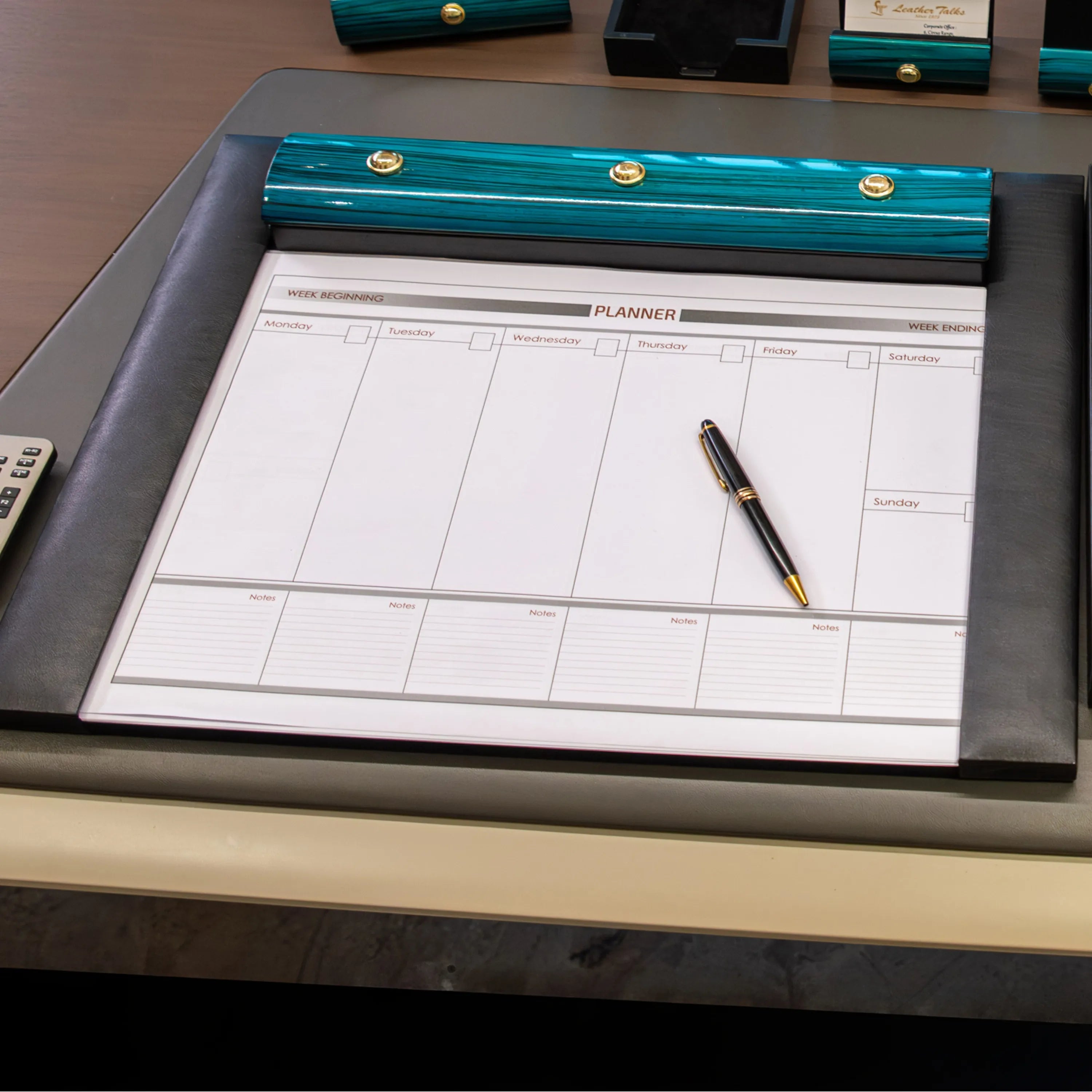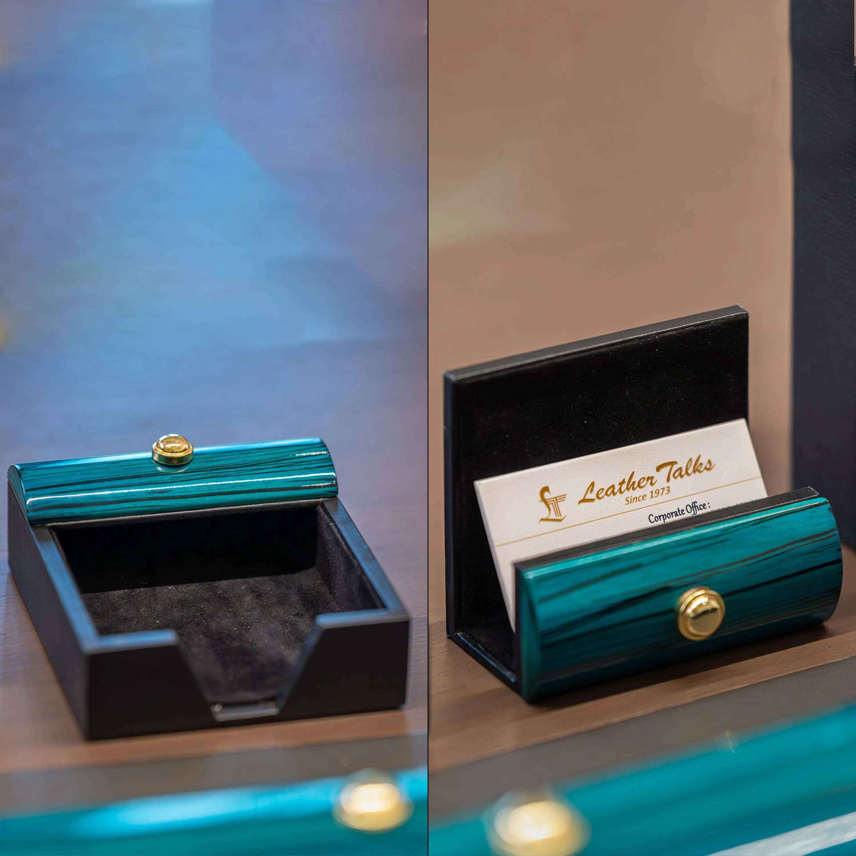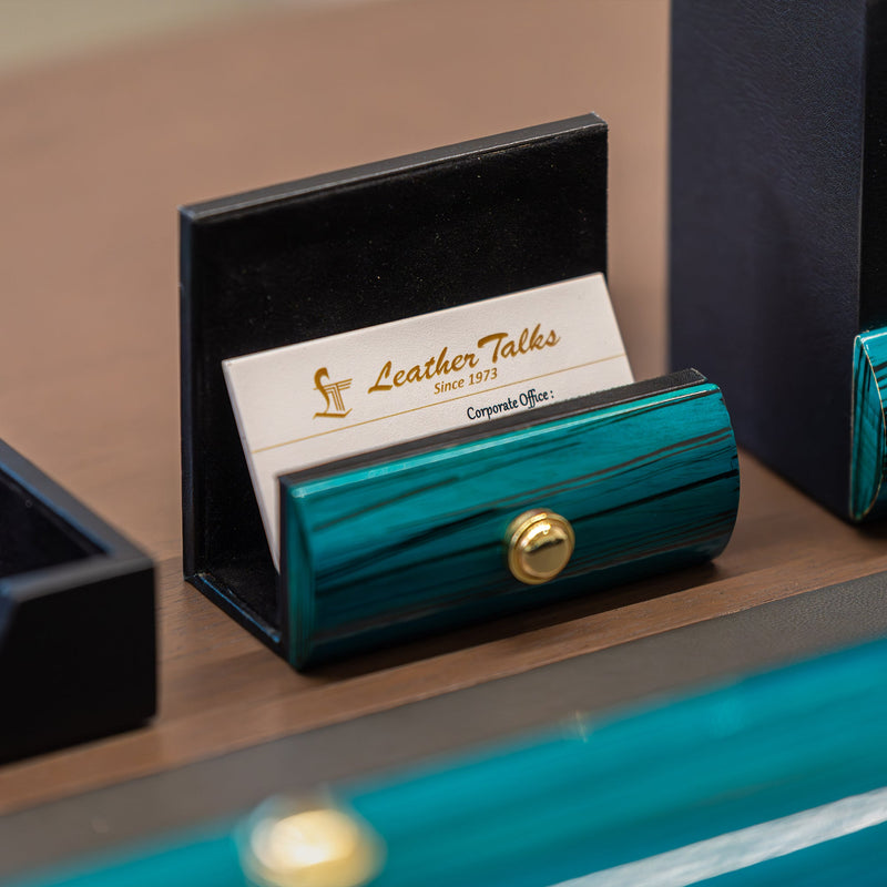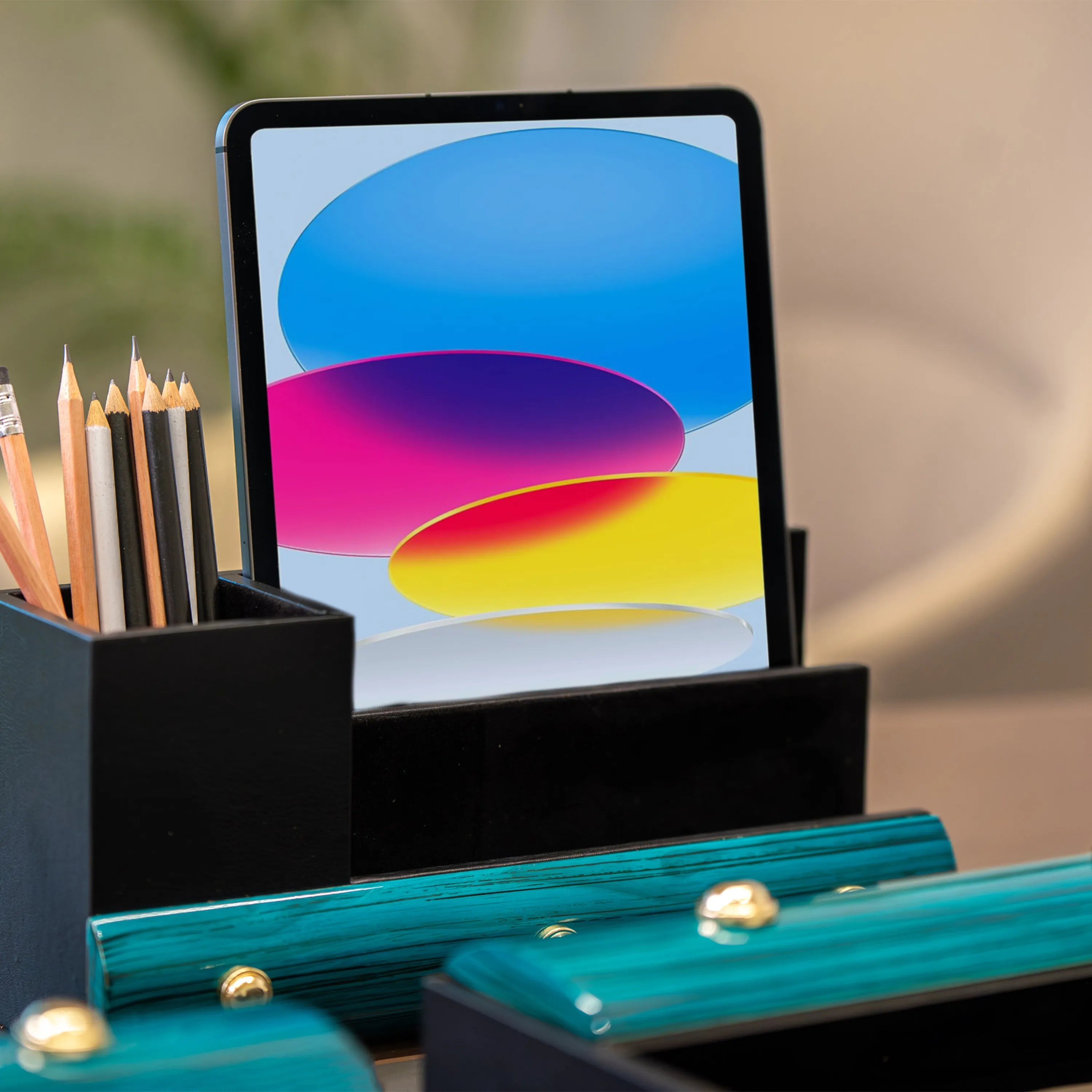 Wood Leather Desktop Planner Set | Genuine Leather Desktop Planner Set | Premium Office Desk Accessories & Luxury Work Organizer | Color - Teal Blue with Black