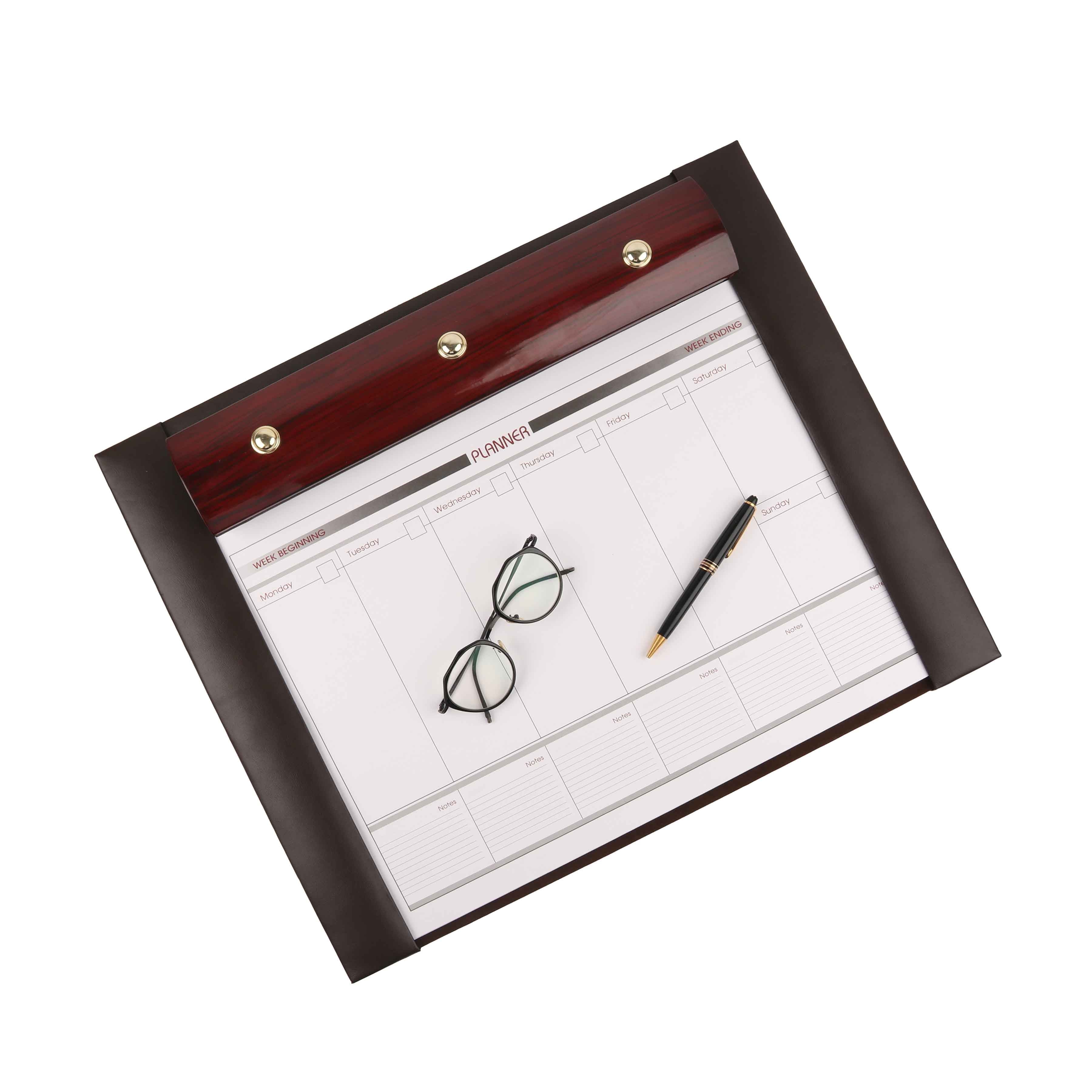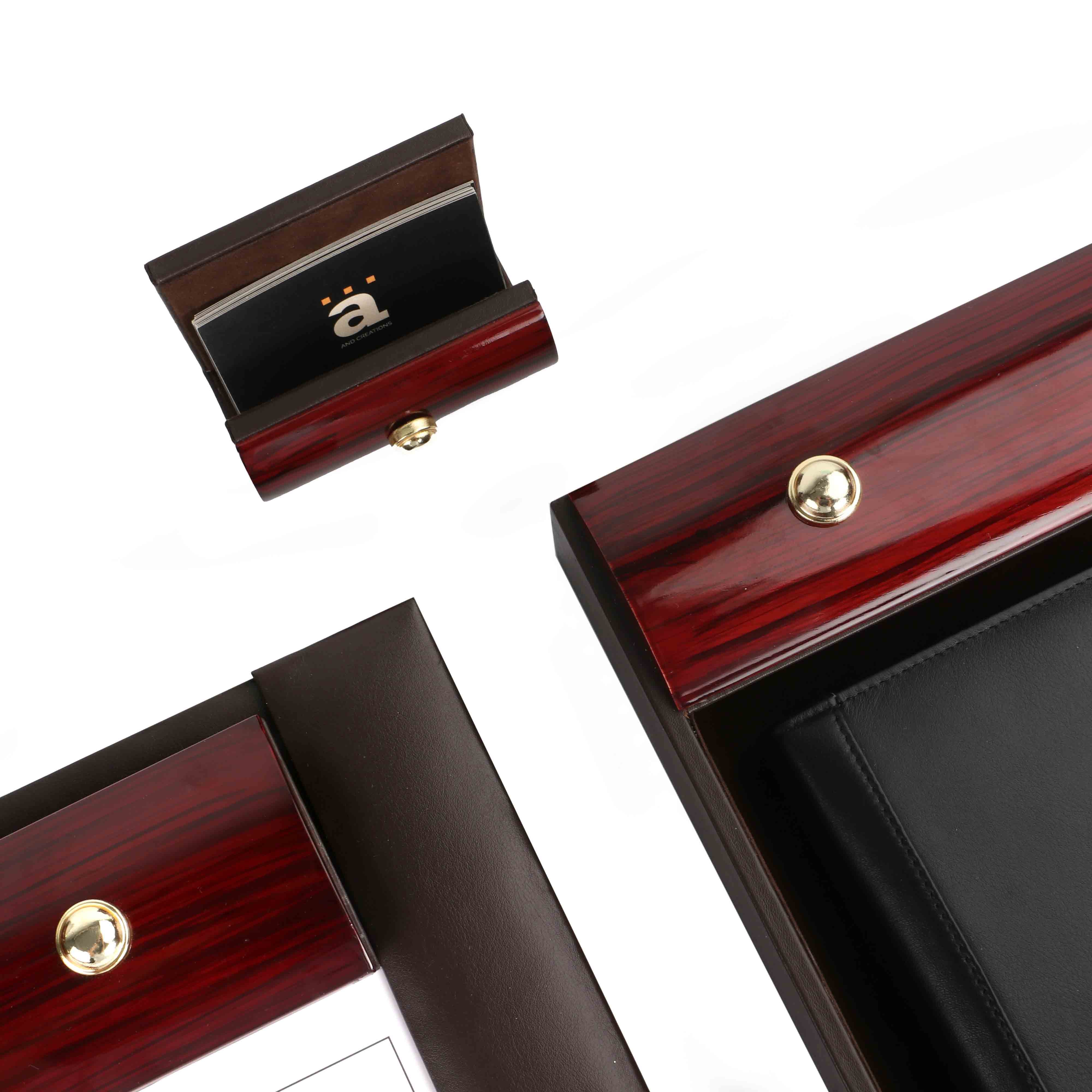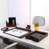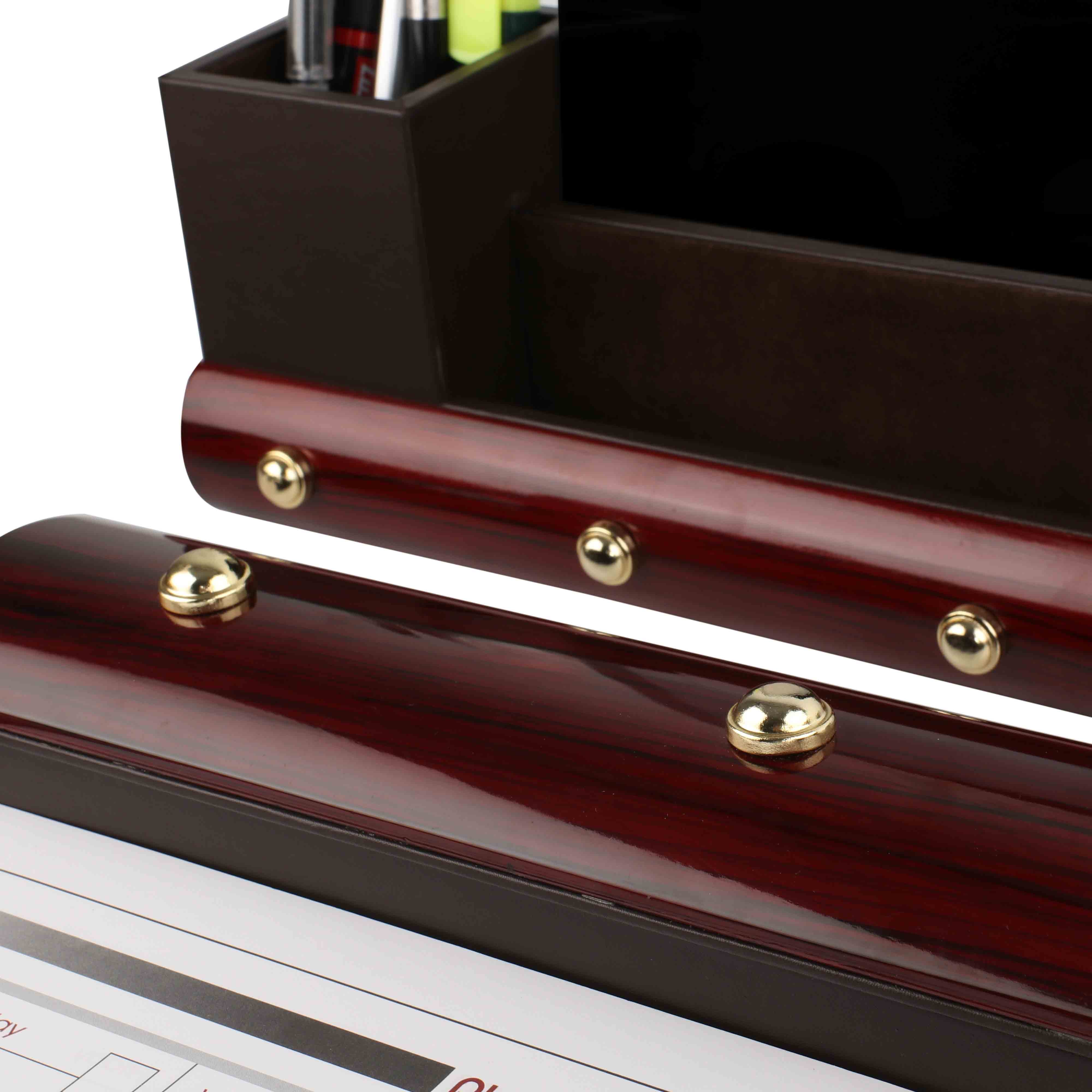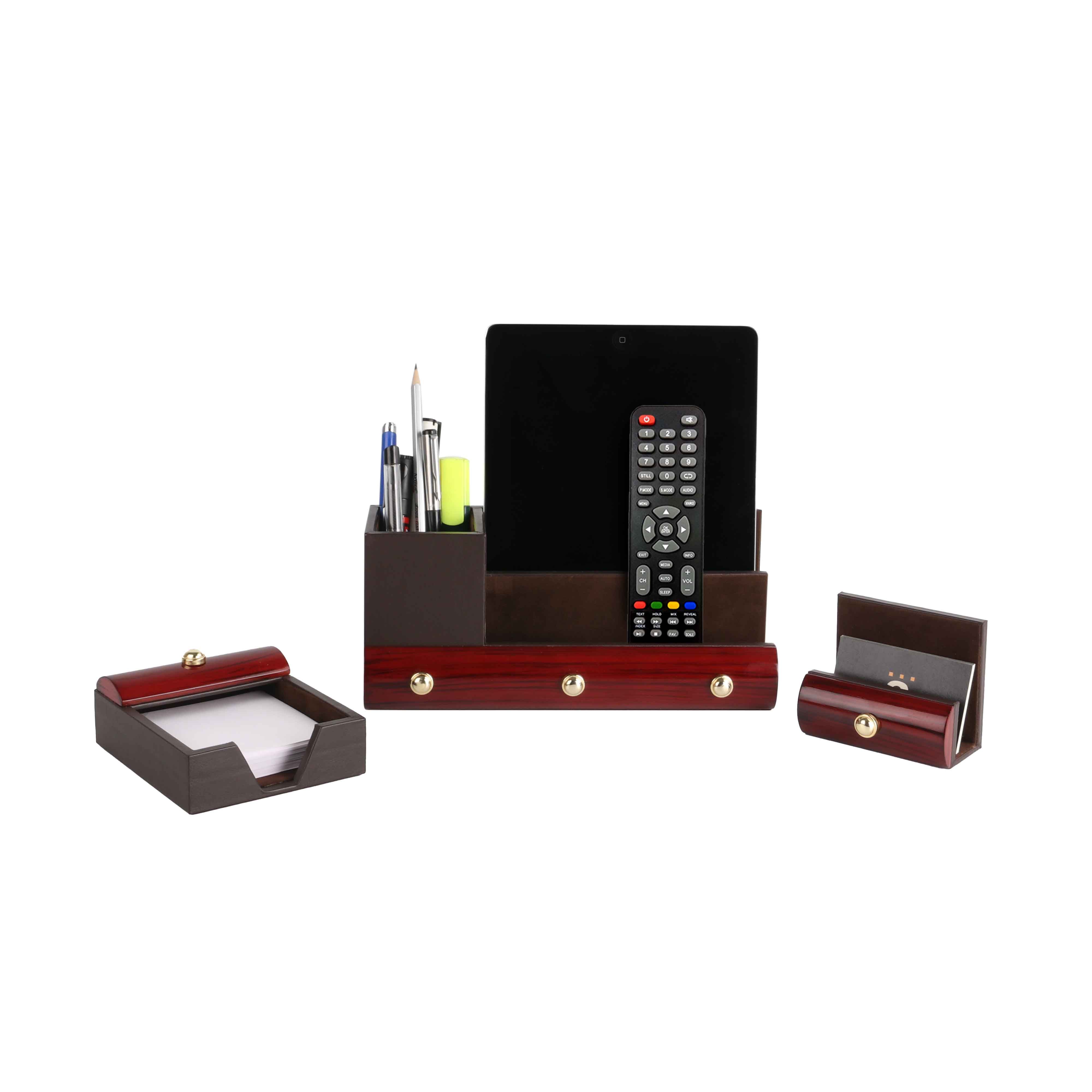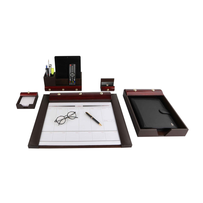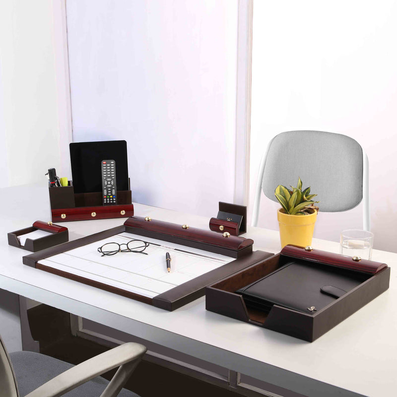 Wood Leather Desktop Planner Set | Genuine Leather Desktop Planner Set | Premium Office Desk Accessories & Luxury Work Organizer | Color- Brown