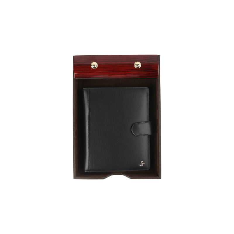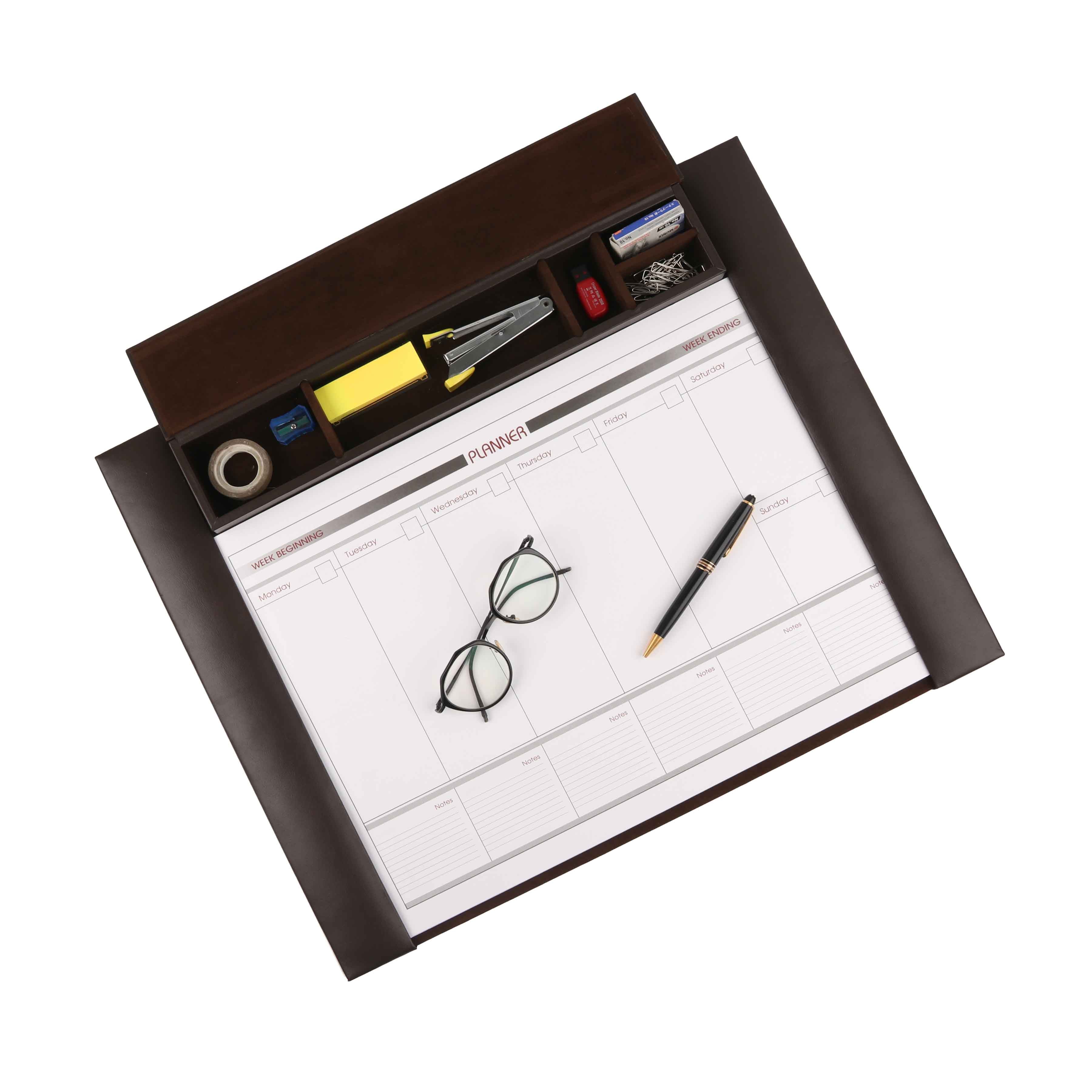 The Planner: The Desktop Planner is crafted out of MDF encased in Genuine Leather. The top part has a box compartment with 4 segregation, perfect to hold your loose stationeries.